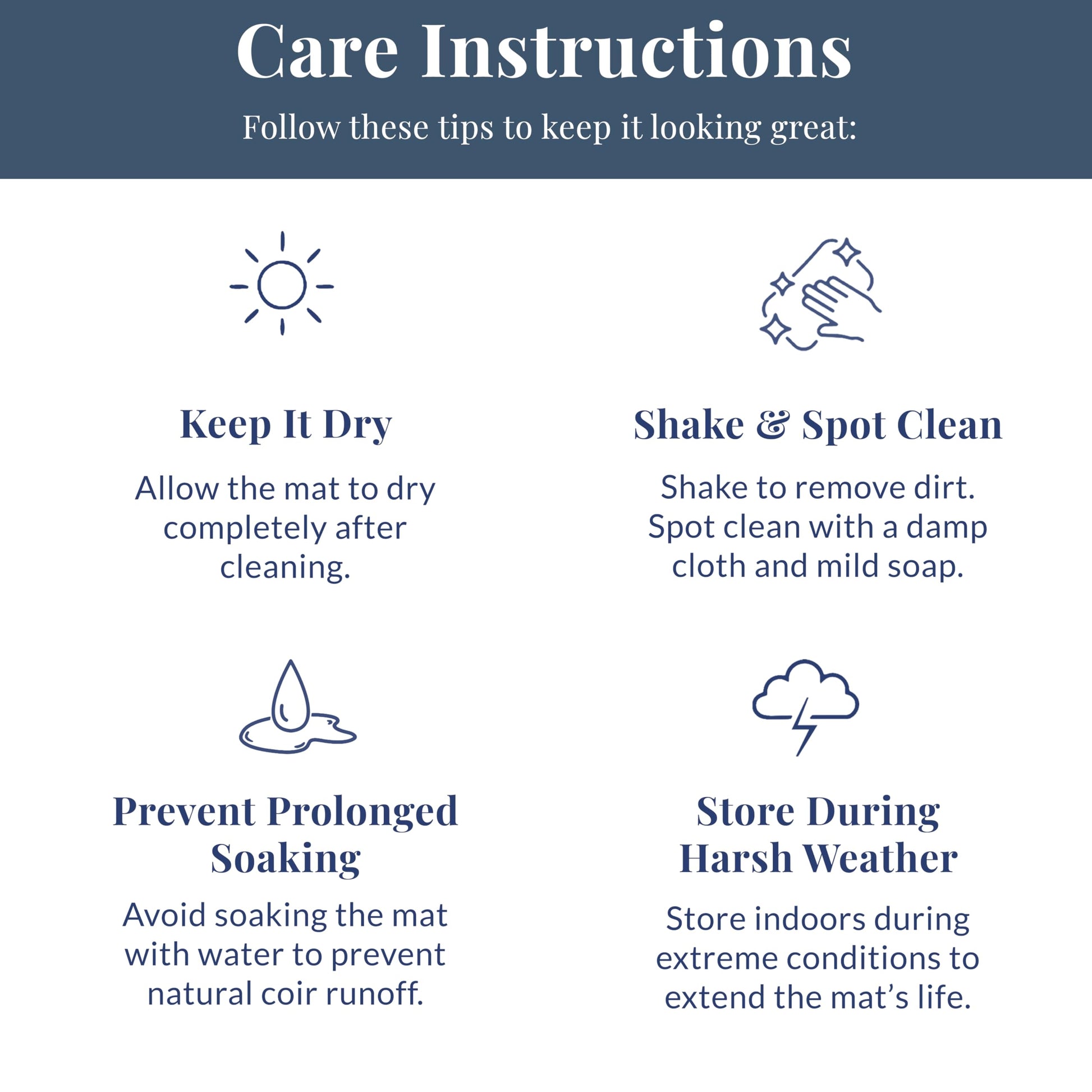 - Made of Durable Coir - Crafted from 100% natural coconut coir fibers, one of the strongest and most durable plant-based materials. Light shedding is normal with all natural coir mats. When wet, coir fibers may release natural color, which can stain floors or surfaces. This is a natural property of coir. For best results, use a protective undermat, allow the mat to dry fully after rain, and place in a covered entryway or on a covered porch.