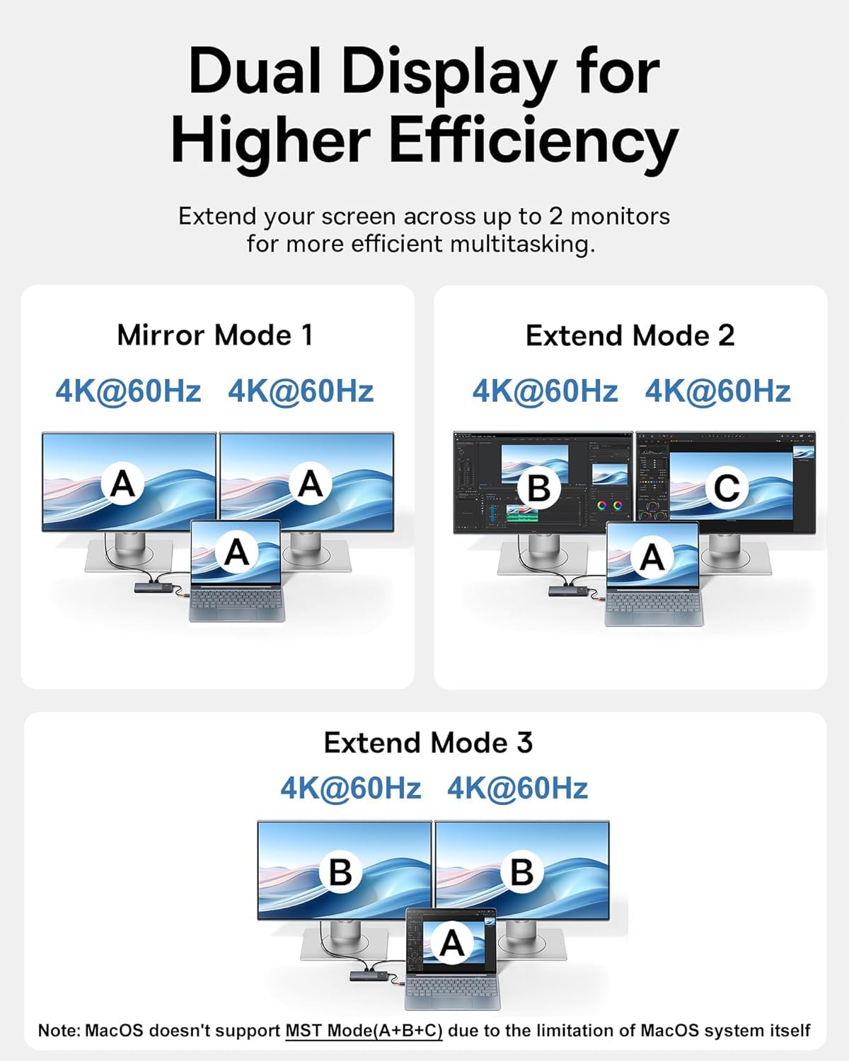 - Dual Display with 4K Clarity: Just cast your screen by using one HDMI port of our laptop docking station and enjoy the stunning 4K@120Hz clarity. Or experience the ultimate visual delight with dual display in 4K@60Hz resolution on both HDMI ports. Immerse yourself in a truly remarkable viewing experience that will captivate your eyes. *Note: Due to the limitation of macOS itself, all extended screen content will be the same. And 4K@120Hz output can be achieved With Windows Laptops under Thunderbolt 4 or DP1.4.