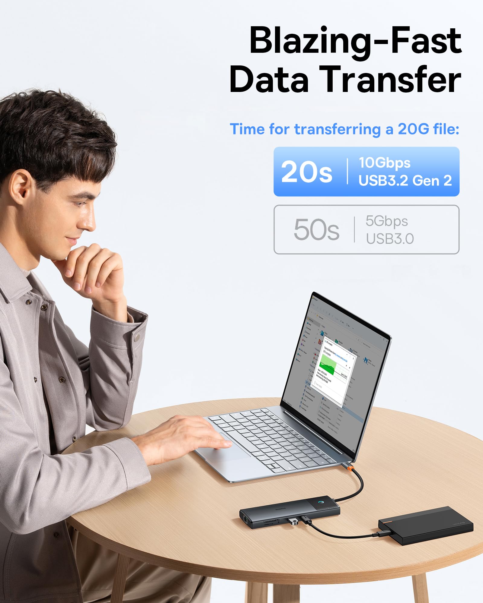- Super-Fast 10Gbps Data Transfer: Up to 10Gbps data transmission speed with the 2 USB 3.2 ports including 1 USB-C Data Port and 1 USB-A Data Port, transferring your big files and pictures in seconds. And the SD/TF card slot allows you to read your memory cards at the same time with speed up to 104MB/s.You can quickly access and transfer your important data without any delays.