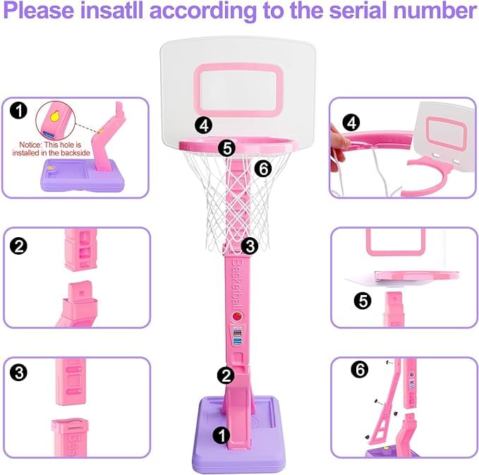 - 【Pink Basketball Hoop for Kids】The kids basketball hoop includes 2 mini basketballs, pump, basketball hoop, basketball board and other accessories. Extremely easy to install and assemble. The height of the pink basketball hoops for girls can be adjusted from 2.3FT-4.5FT, which is great for growing toddler girls . Perfect toys for 3 year old girl,adjustable basketball hoop outdoor indoor, mini basketball hoop for kids 3-5 4-8,christmas gifts for girls.