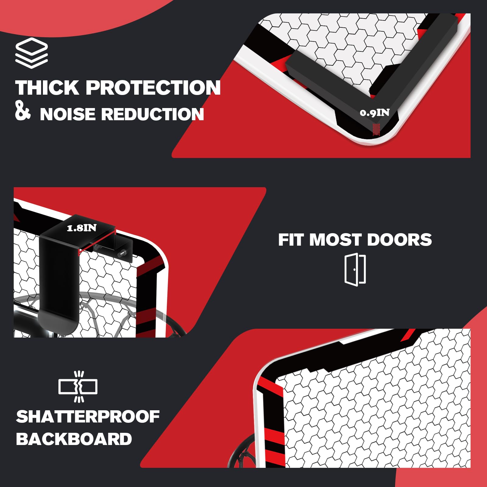 - 【Excellent Quality】 Our basketball hoop consists of a shatterproof backboard and a steel basket. The shatterproof backboard is sturdy and impact-resistant, and the spring-type design and steel basket prevent the basket from breaking after a strong dunk, ensuring safety during use. It is also equipped with 6 shock-proof sponges to reduce noise and prevent scratches on the basket door.