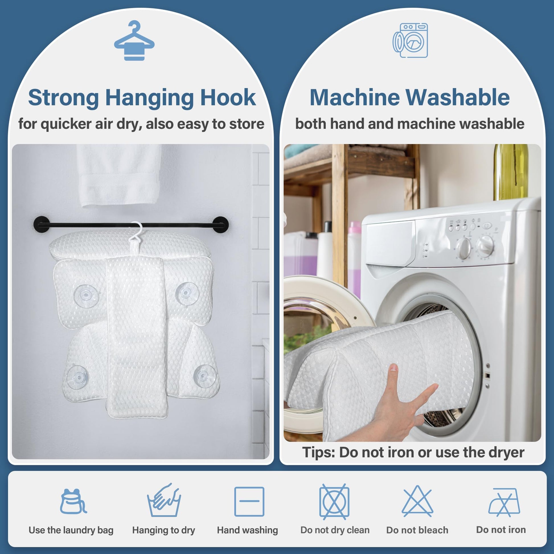 - Machine Washable & Built-In Drying Hook: Either wash by hand or wash in the washing machine with gentle detergent on the gentle cycle. With convenient built-in hanging hook design, the bath tub pillow can be hang up to dry after each use, for fast and easy air drying to prevent the accumulation of water to keep the pillow fresh and clean.Always air dry, do not iron. Tips: Use a mesh bag for machine washing to prevent suction cups from sticking to the machine. (Mesh bag not included)
