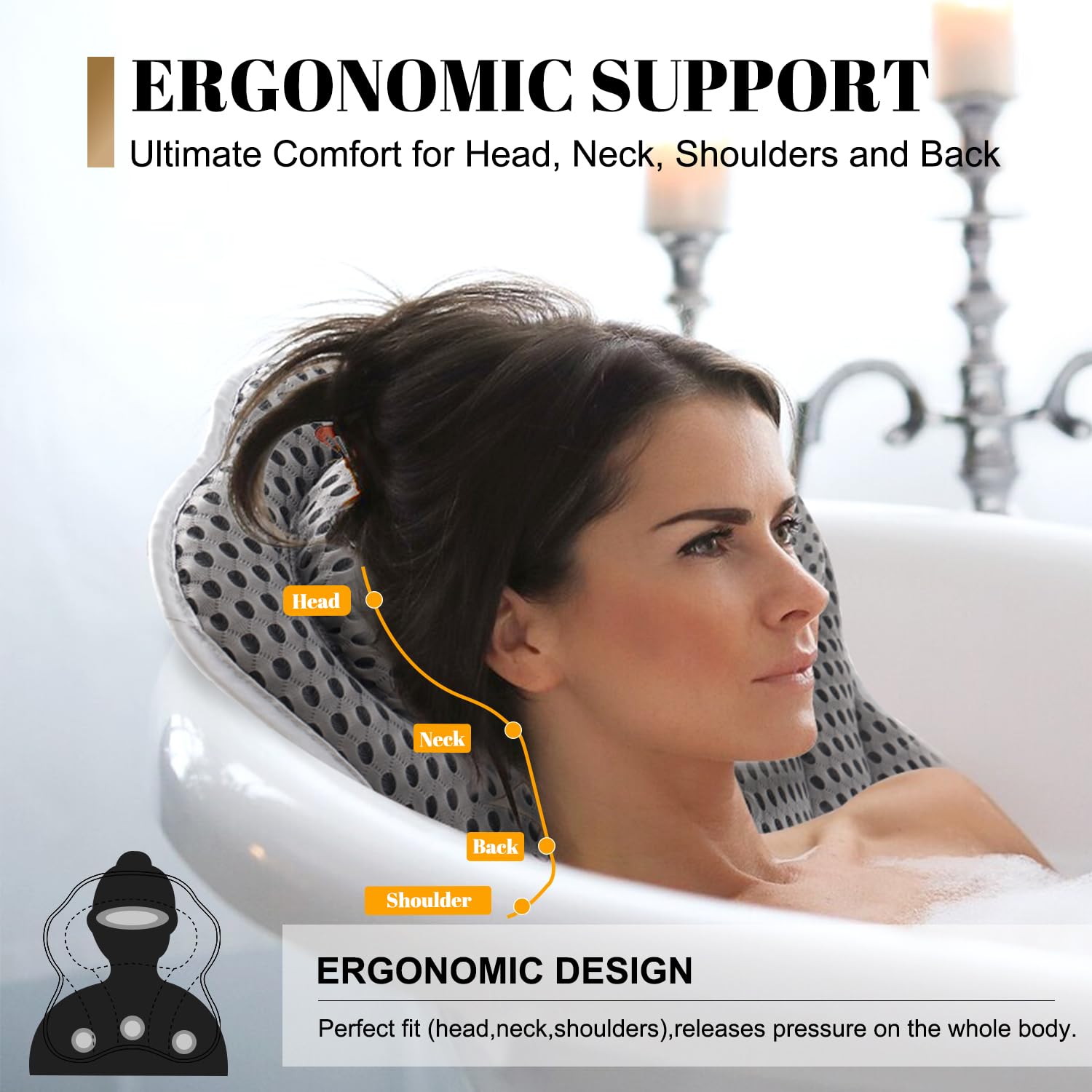 Bath Pillow Spa Bathtub Pillow with Non-Slip Suction Cups, Head, Neck, Back & Shoulder Rest Support, Soft & Luxury Bathtub Cushion, Bath Pillow Fit Hot Tub, Bathtub (Grey)