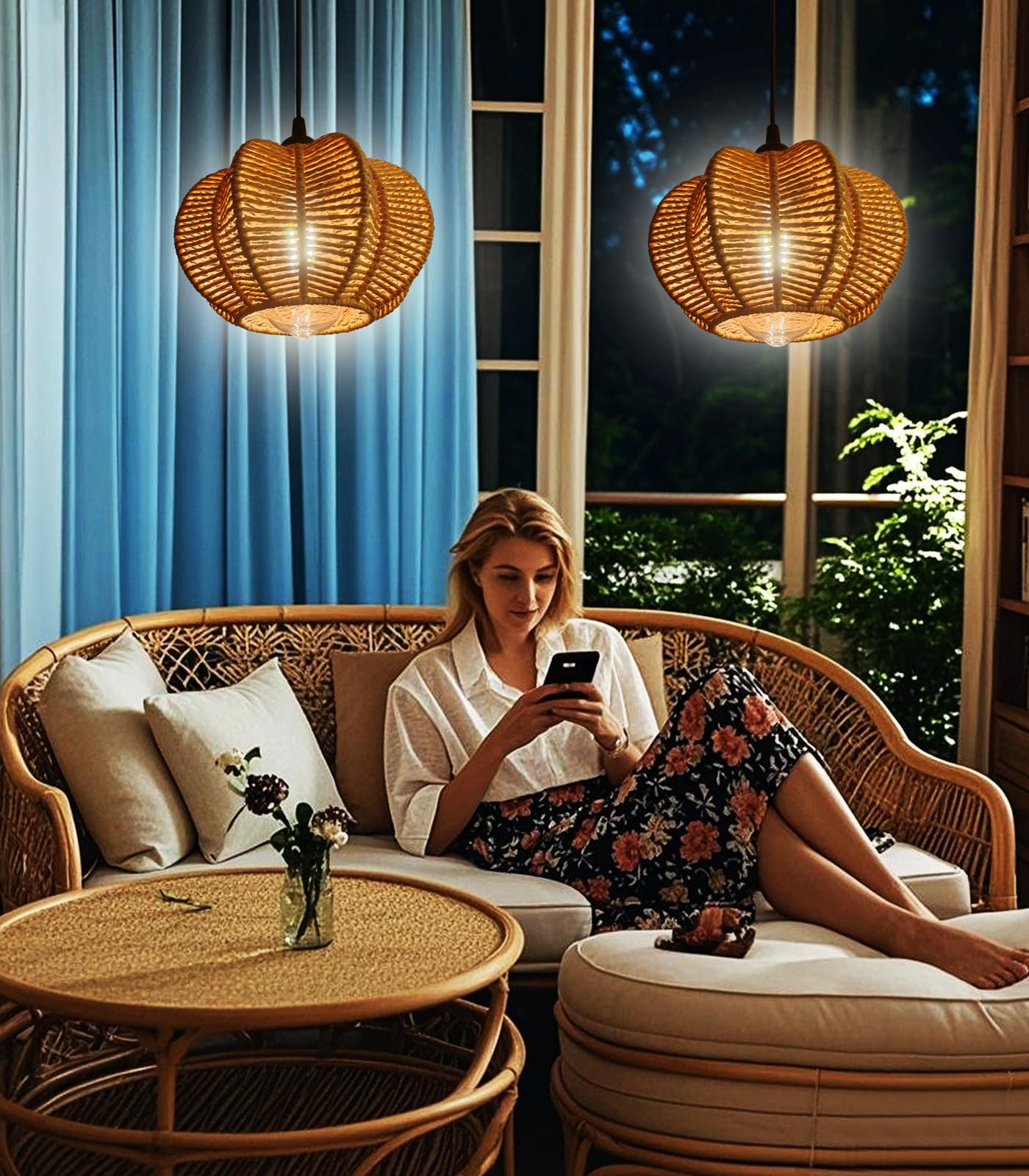 - Bohemian Rattan Lampshade: The outdoor gazebo chandelier with handwoven boho rattan lampshade features a unique pumpkin shaped design, which makes it more beautiful. Whether as a replacement lampshade or a standalone decoration, this hanging porch light can perfectly fit into any place.