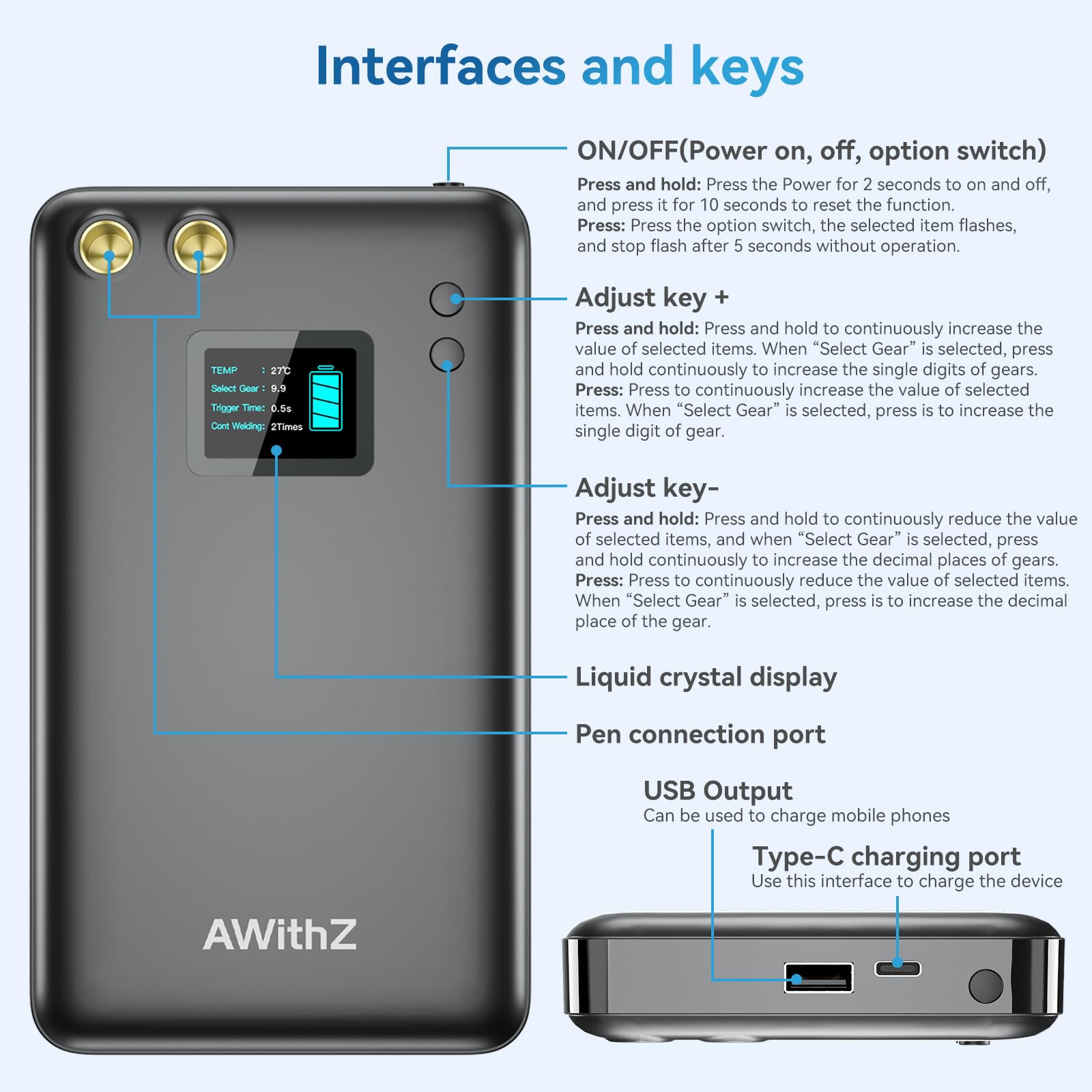 - Product Button Design: Clear division of labor for battery spot welder buttons, and easy to operate. Press and hold on/off at the top, and press to select an option. The other two buttons can move forward and backward (except for gears) for the option you have selected.