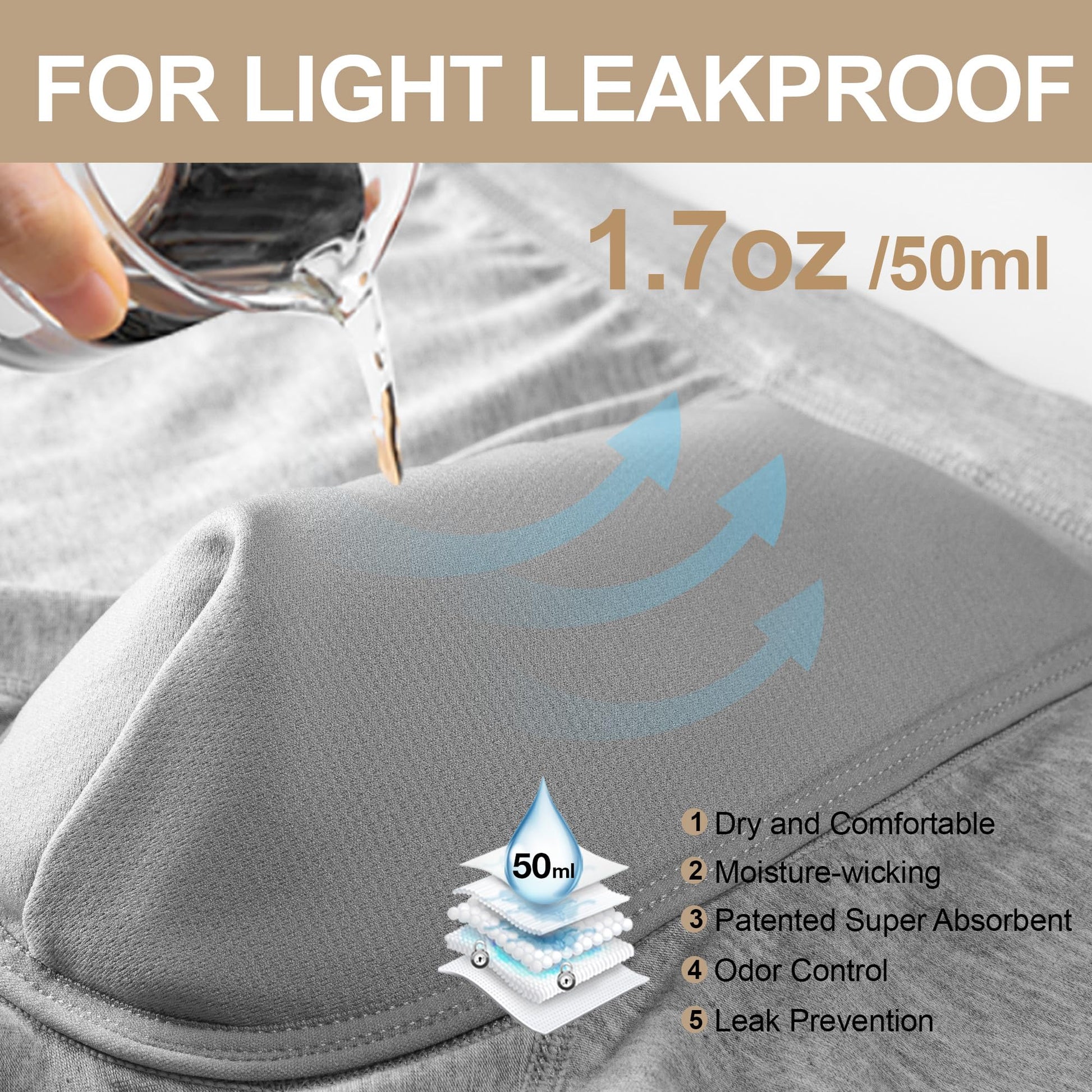 - BUILT-IN ABSORBENT INCONTINENCE UNDERWEAR FOR MEN: 5 layers for liquid absorption,moisture wicking, ordor lock and leak proof. You will feel dry and comfortable all day.