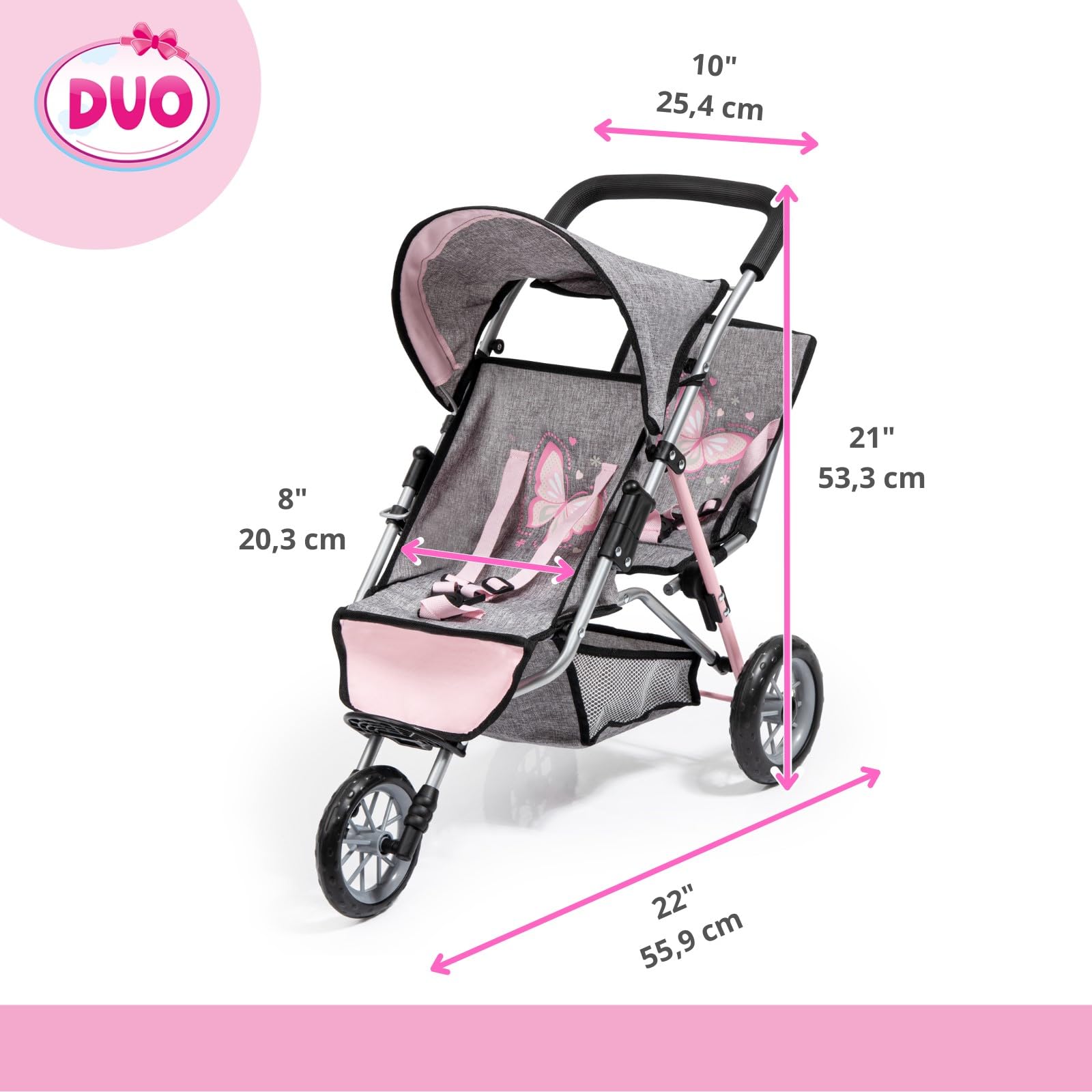 Bayer Design - Twin Dolls Pram Duo Grey Pink Butterfly - Double Stroller for Dolls, Sun Canopy, Security Belt - Dolls Up to 18” - Age 3+ - 39133AA