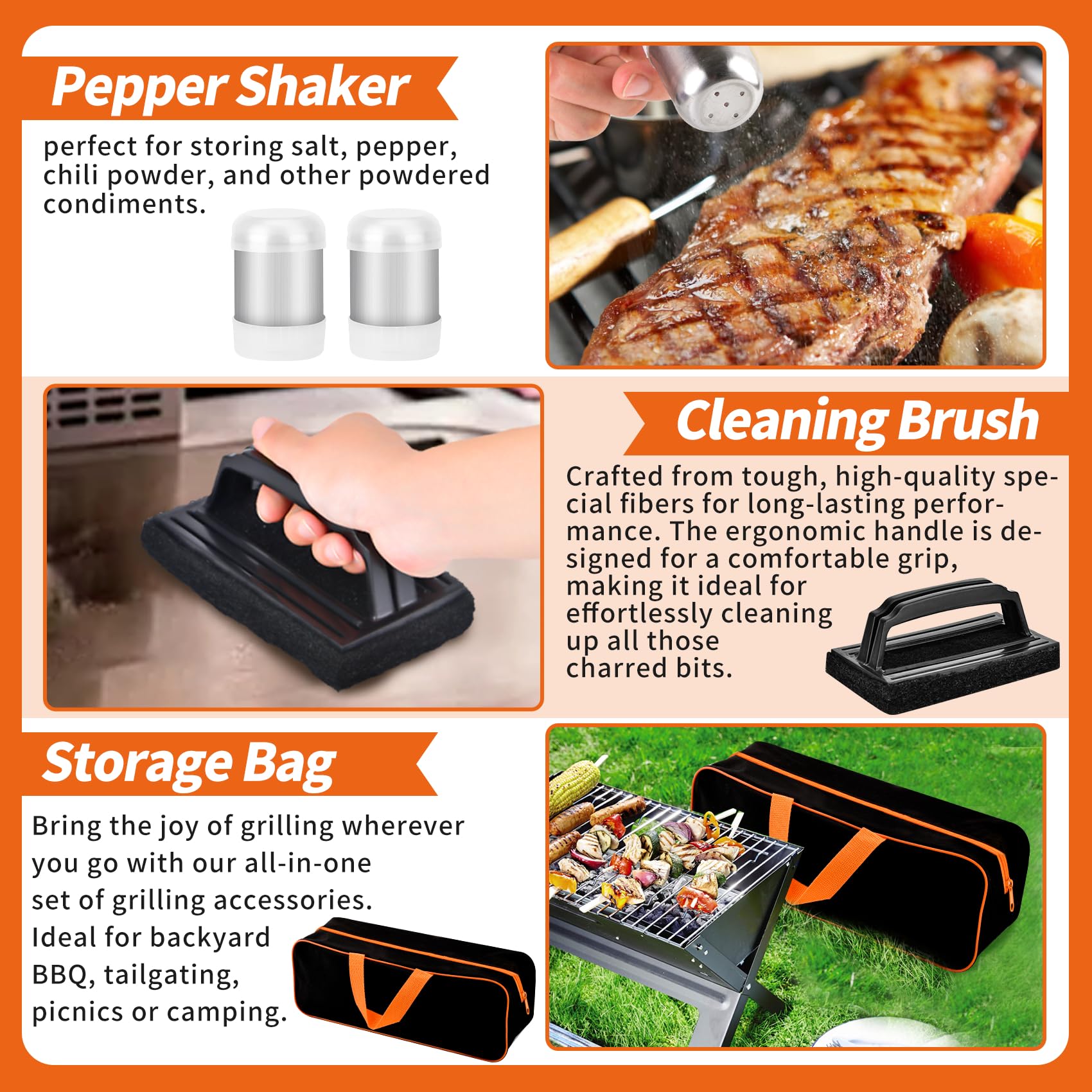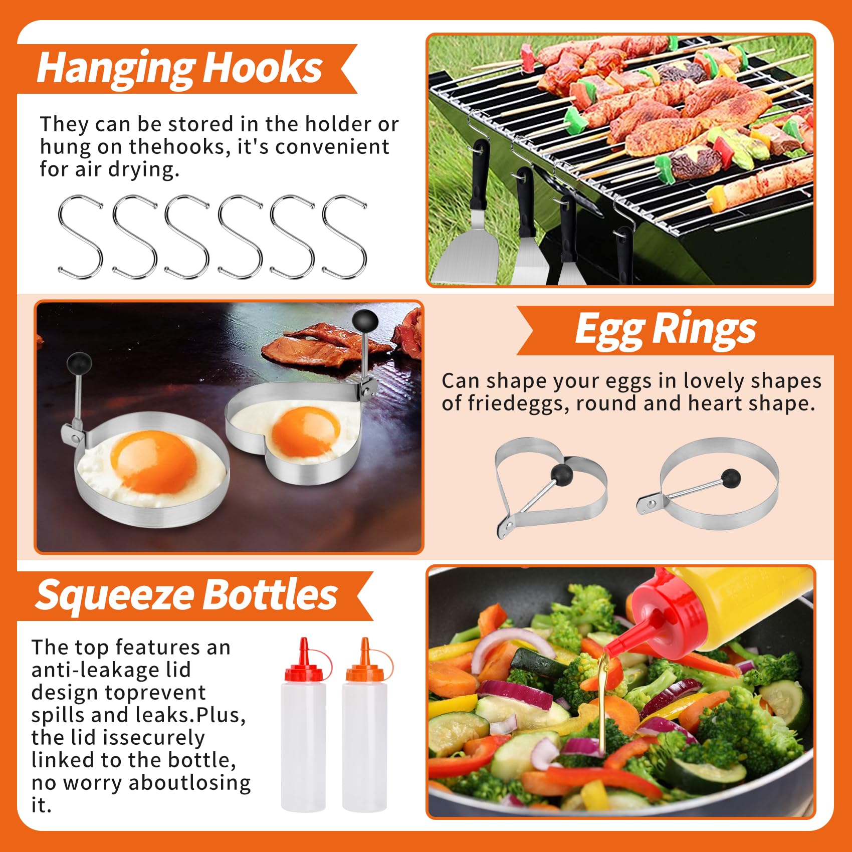 - 【Perfect Complete Set】This griddle accessories kit includes: 1 extra wide burger spatula, 1 burger press, 1 long spatula, 1 slotted spatula, 1 flipper, 1 scraper, 1 chopper, 2 pepper shakers, 2 squeeze bottles, 2 egg rings, 1 stainless steel grill melting dome, 6 hanging hooks, 1 cleaning brush and 1 storage bag.