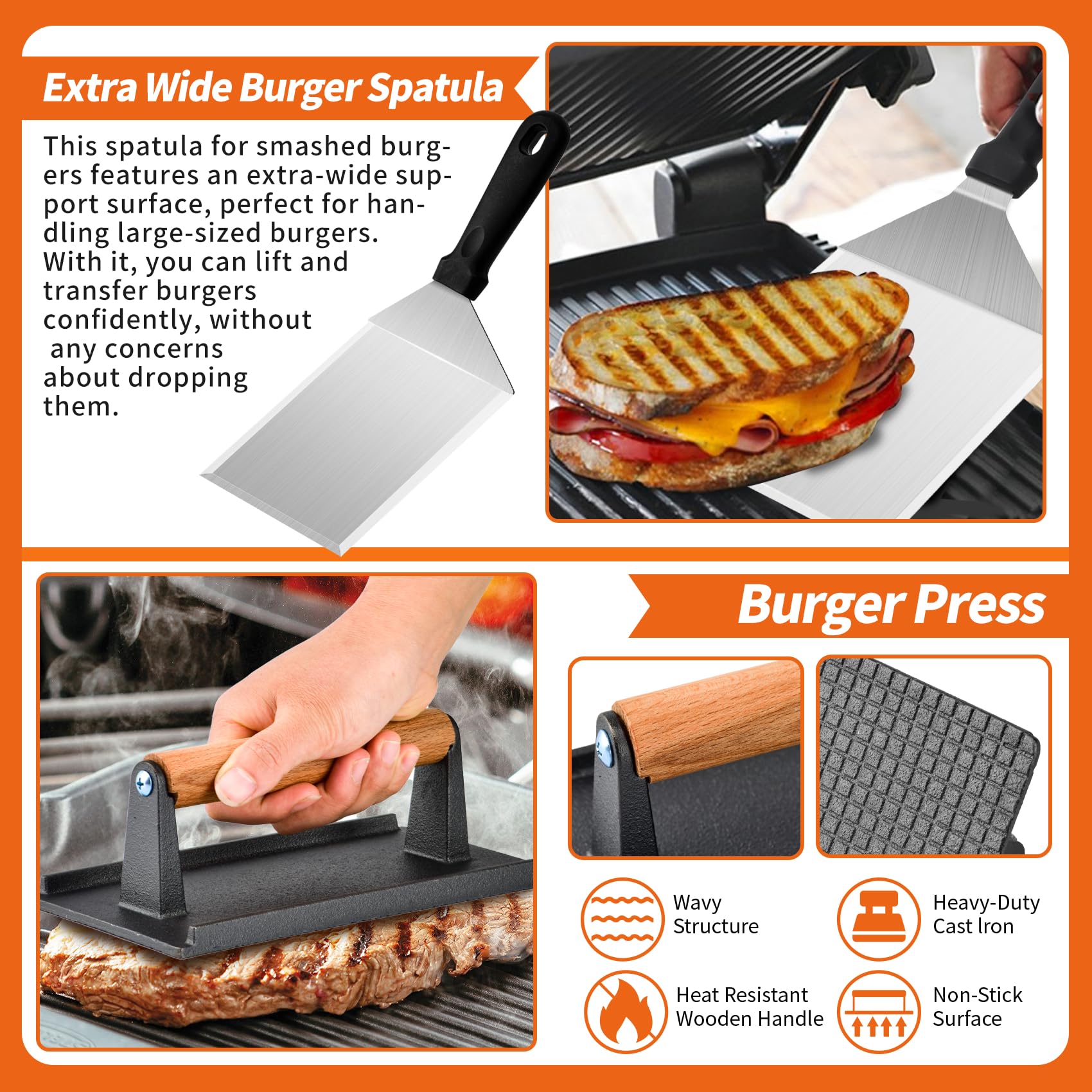 - 【Professional Griddle Kit】This practical griddle utensils set is for most griddle grills and suitable for indoor and outdoor cooking, which will allow you complete all the griddle applications. Great for flipping burgers, pancakes, veggies, cutting bread, meat and sausage, perfect to scraper griddle clean.