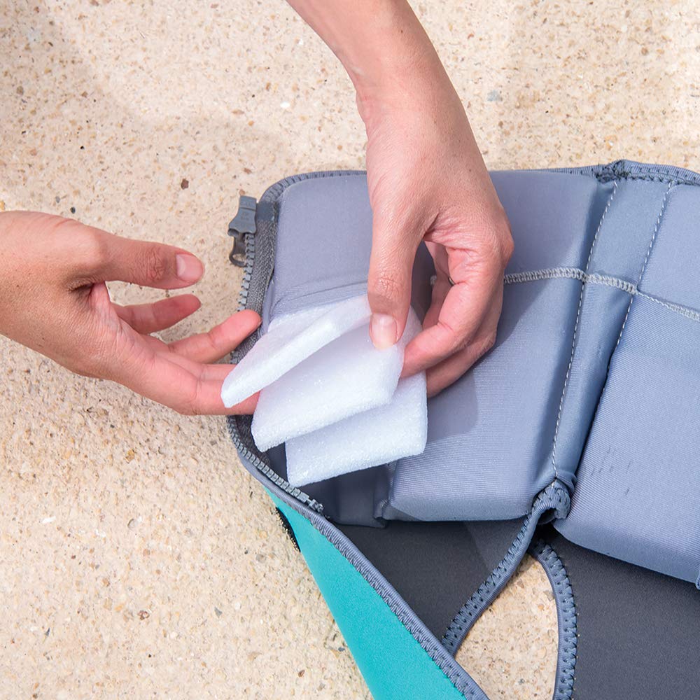 - Quick and easy to put on and take off. 8 independent removable floats with 3 levels of buoyancy each.