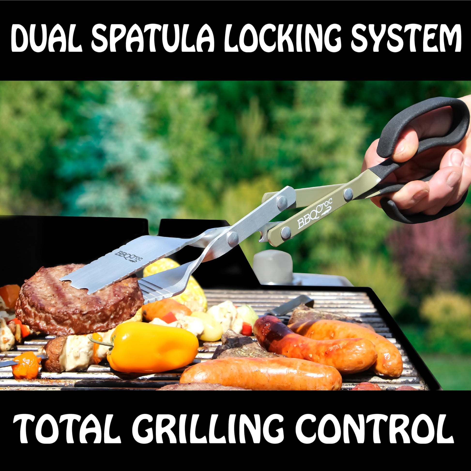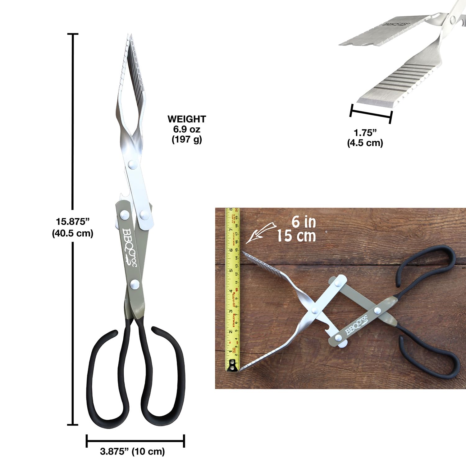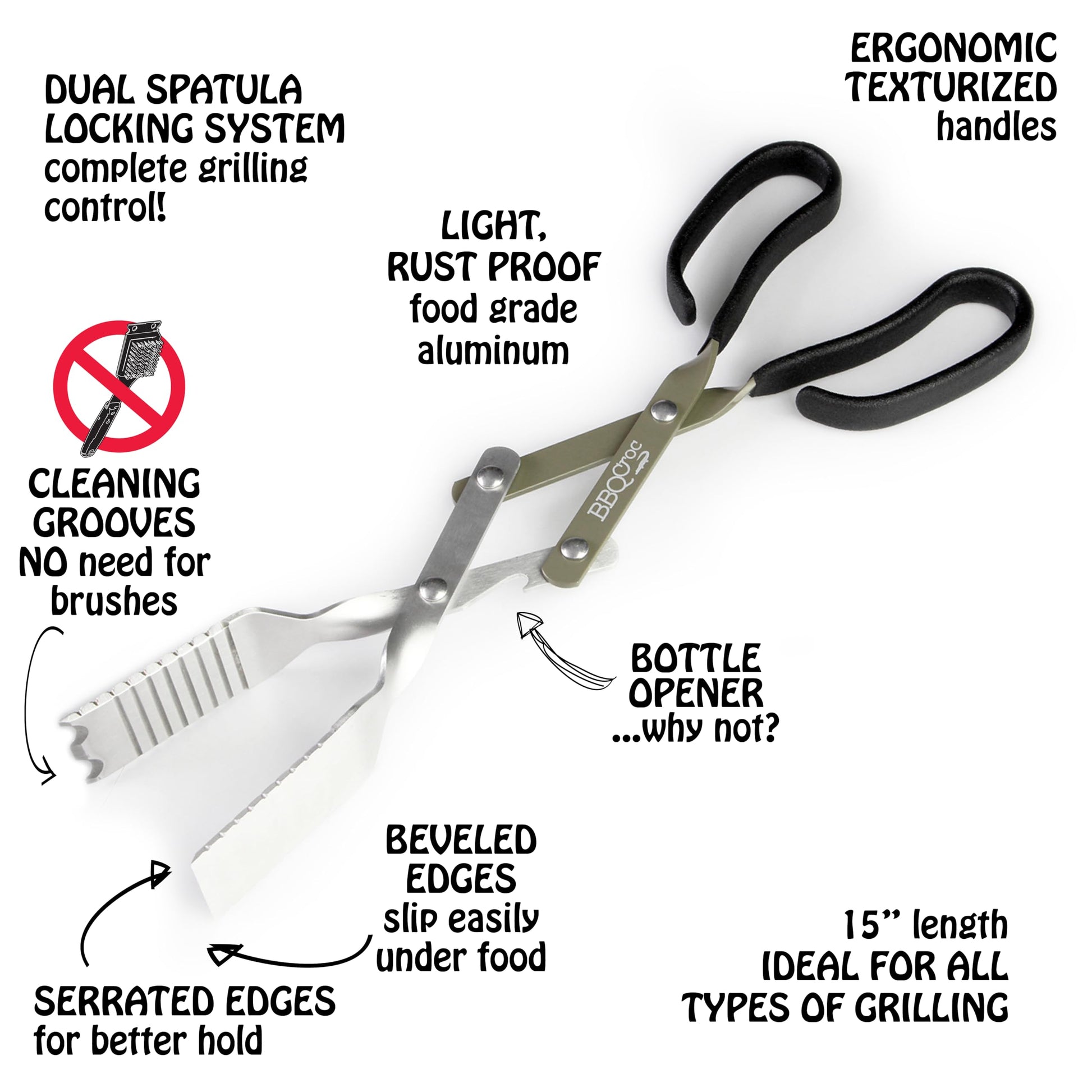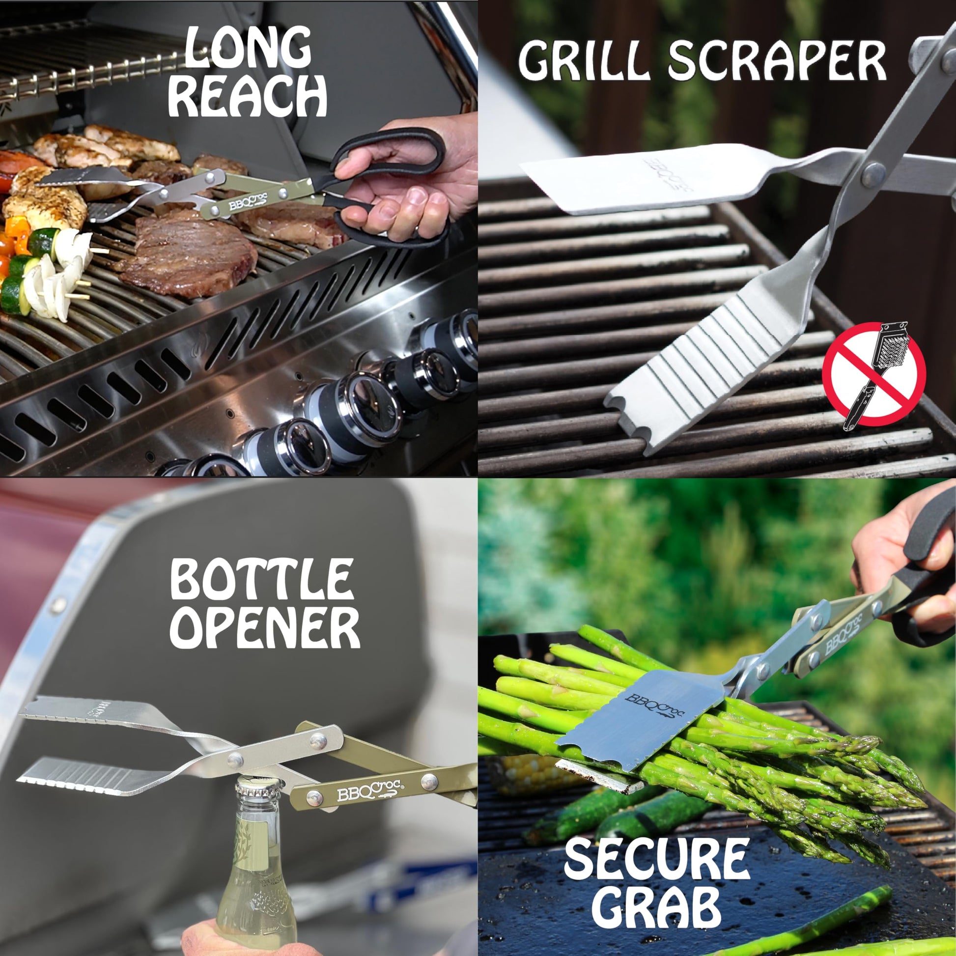 - ALL-IN-ONE SOLUTION: Say goodbye to the hassle of juggling multiple grilling tools. The BBQ Croc combines the functionality of tongs, spatulas, and a grill scraper into one convenient tool. Its 1 ¾ inch wide spatulas are perfectly sized for grabbing and flipping with ease, while the beveled edges slide effortlessly under stuck-on food.