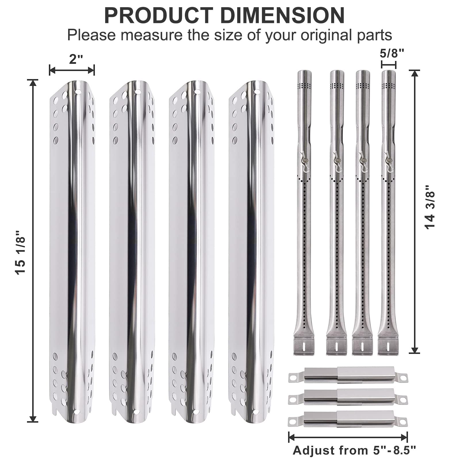 - 【Product Material & Size】Burner Dimensions: 14 3/8" x 5/8", Material: stainless steel, Heat Tent Dimensions: 15 1/8" x 2", Material: stainless steel, Carryover Tube Dimensions: adjust from 5" - 8.5" L, Material : stainless steel. NOTE: DO NOT Fit for Charbroil Performance, Please confirm size before ordering
