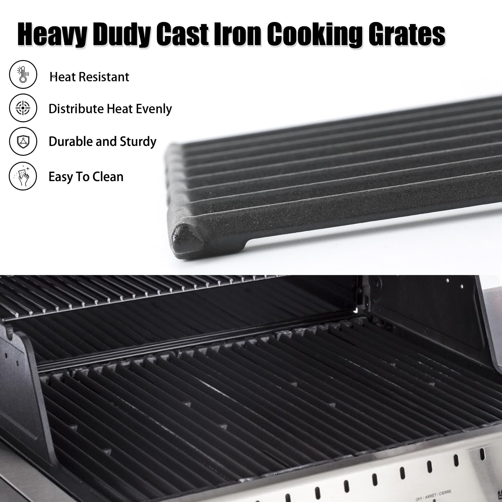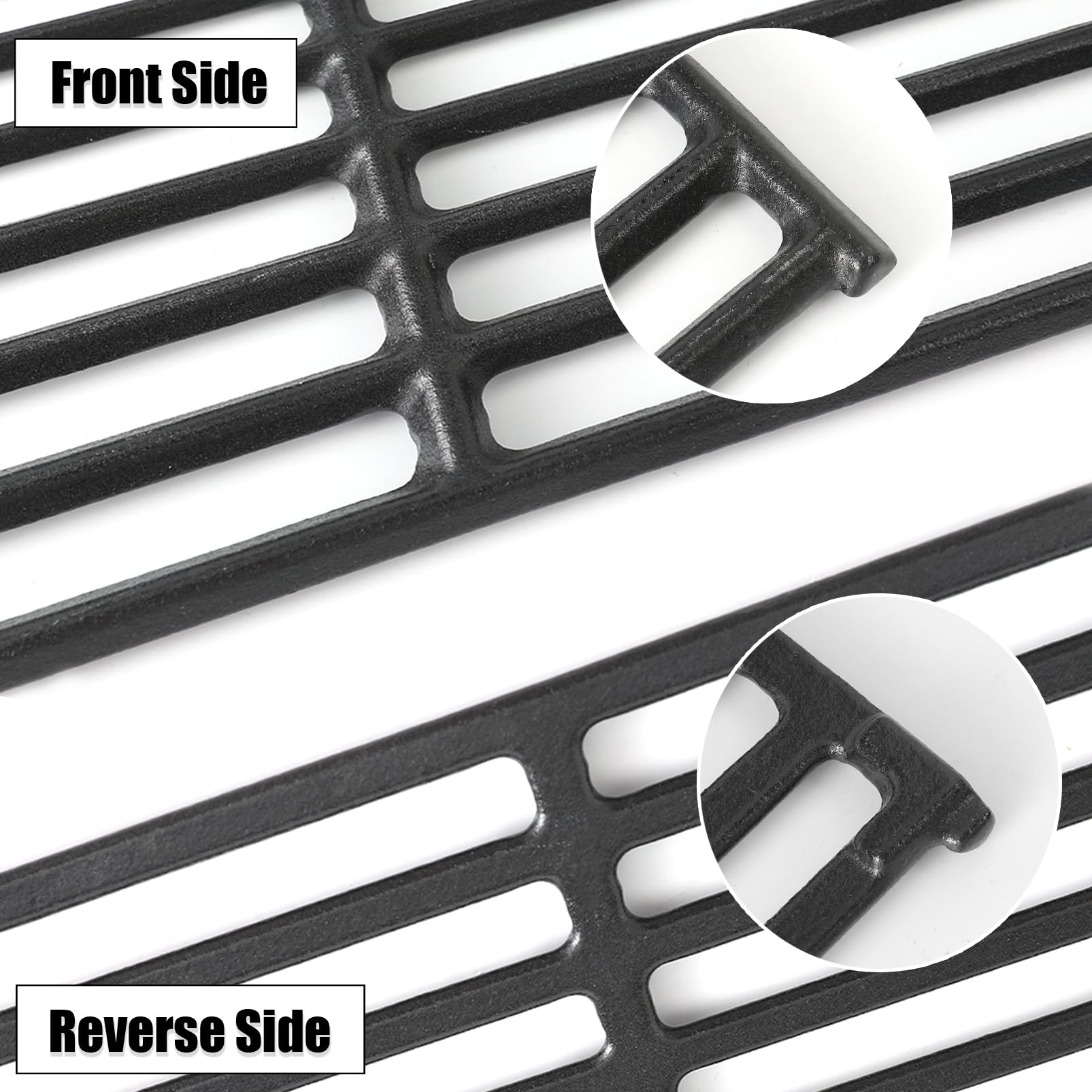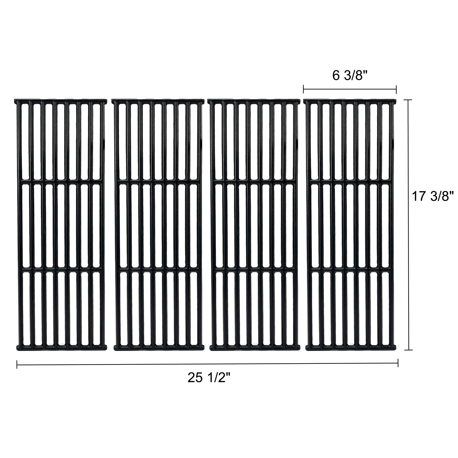 - Package Includes: 4pcs Cast Iron Cooking Grates. Dimensions: 17 3/8" x 6 3/8" each, 17 3/8" x 25 1/2" total
