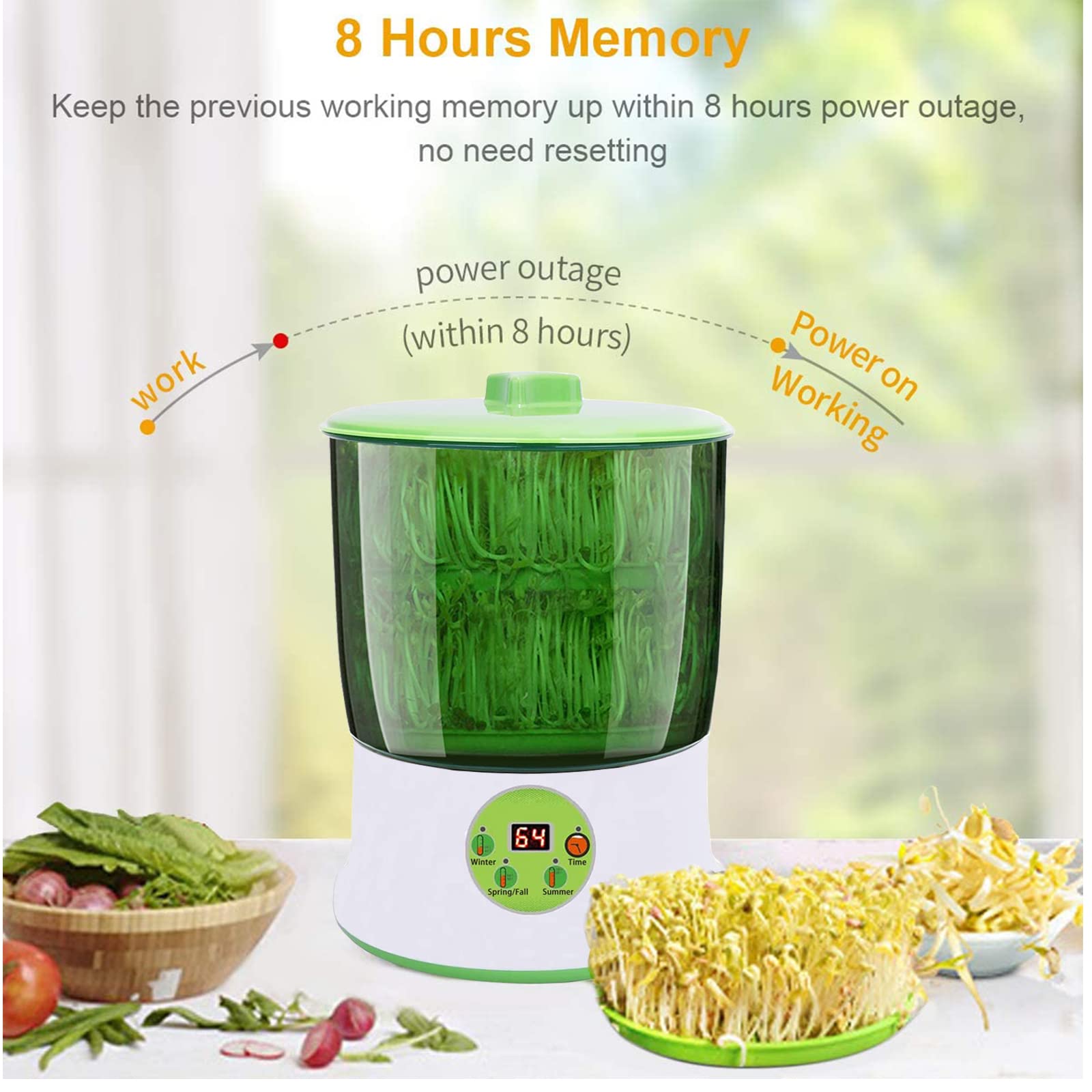 - Time Control LED Display:After setting the sprout time, you can see the time update on the LED display.The machine will stop when time's up. Safety design: water and electricity separation,Don't worry about leakage. 8 hours power-off memory function:If the power supply is interruped within 8 hours for chaning water or other situations,the machine will continue working as long as power supply return to normal.