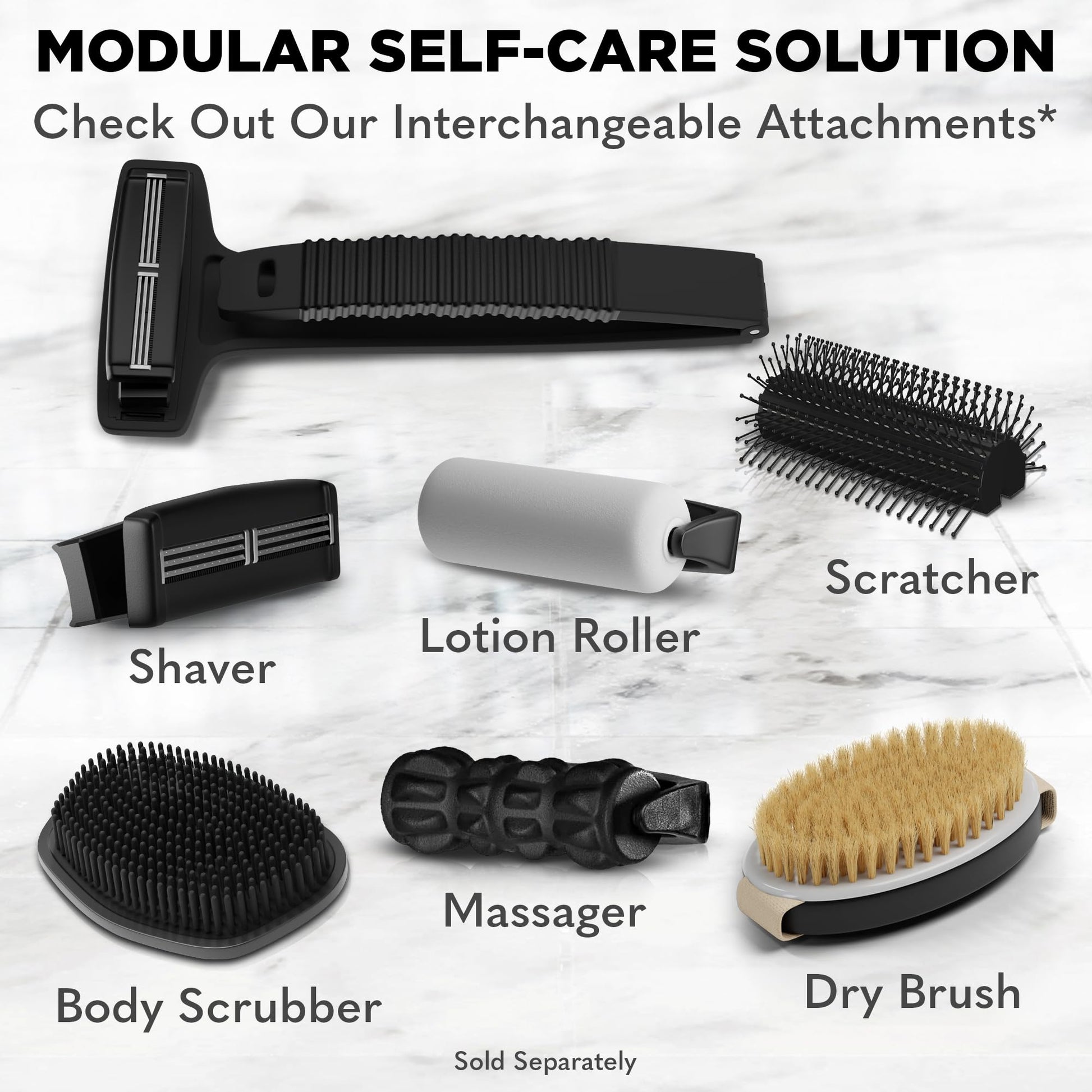 Details: Take control of your grooming game with the Bearback Back & Body Shaver - the premium DIY solution designed for men who demand independence and excellence in their personal care routine. Gone are the days of awkward requests for help or settling for hard-to-reach spots. This innovative shaver puts professional-grade grooming capabilities right in your hands. The Bearback Back & Body Shaver features a revolutionary folding handle that extends from 9.5 to 17 inches, giving you complete coverage from every angle. The ergonomic grip ensures perfect control whether you're detailing your chest or tackling those impossible-to-reach areas on your back. Our pivoting triple-blade cartridge system is crafted from premium Swedish stainless steel. The floating head automatically pivots to every contour of your body, delivering a consistently smooth shave without the nicks, cuts, or irritation you've experienced with lesser tools. Whether you're preparing for a beach vacation, maintaining your gym-ready physique, or just keeping up your professional appearance, the Bearback delivers perfect, irritation-free results every time. Use it wet or dry, in the shower or at your convenience. The quick-release blade system makes maintenance a breeze, while the premium construction ensures this is a grooming investment that's built to last. The Bearback isn't just a back shaver; it's a complete body grooming solution that integrates seamlessly with our full line of available Bearback attachments - including a body scrubber for the shower, and a therapeutic back scratcher! Don't let unwanted body hair hold you back from feeling your most confident. The Bearback Back & Body Shaver ensures you'll always look your best. Join thousands of men who have discovered the freedom of professional-grade grooming without the expensive price tag and take your grooming routine to the next level.