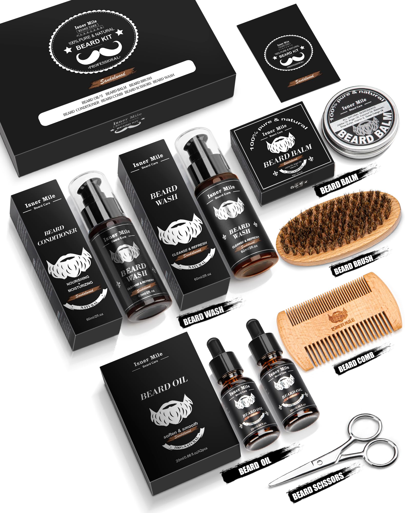 Beard Grooming Kit for Men, Gifts for Him Dad Fathers Man Boyfriend with Shampoo Wash, Conditioner, Care Oil, Balm Softener, Double-sided Comb, Bristle Brush and Trimming Scissors