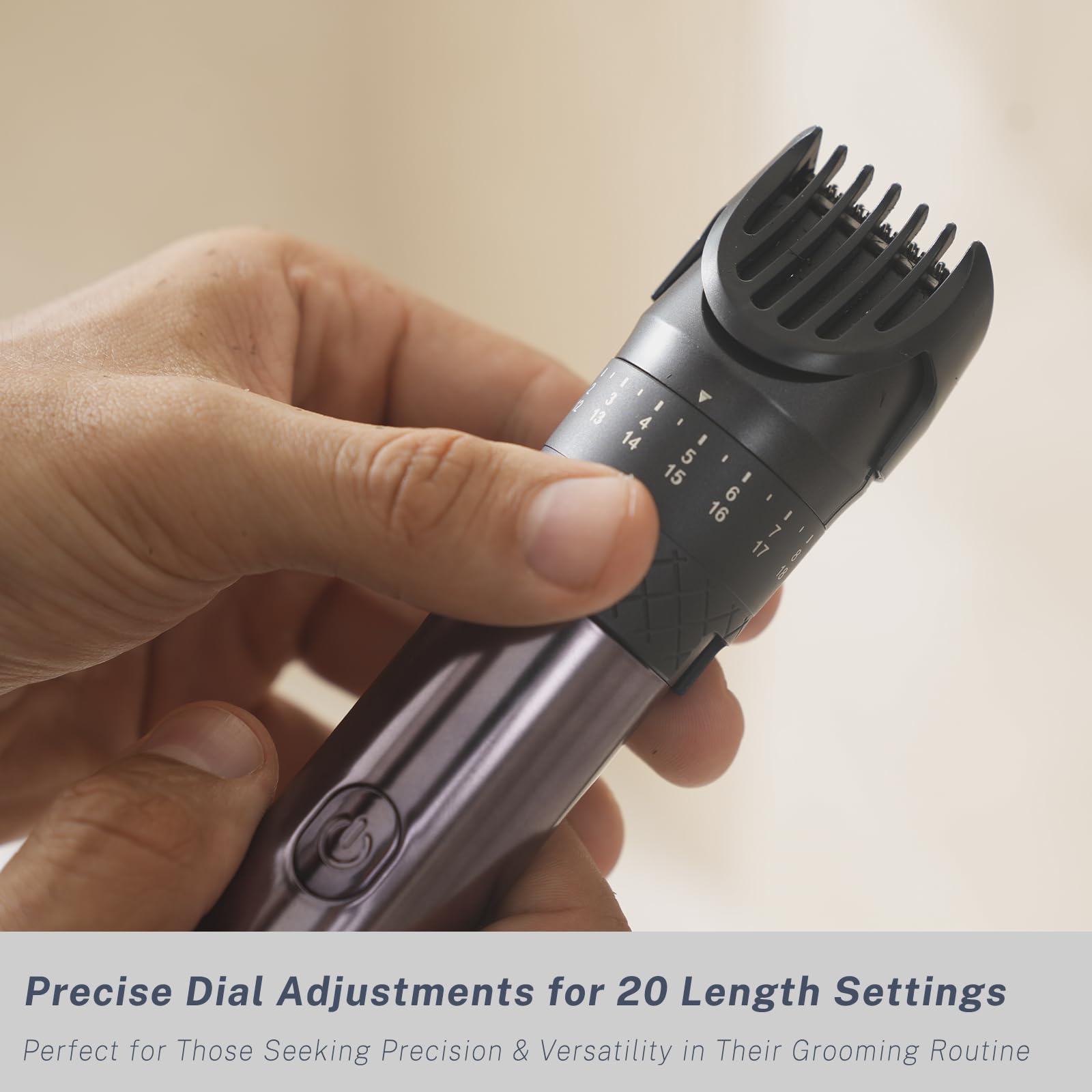 - [ Precise Dial Adjustable 20 Settings ] - The beard and mustache trimmer for men with guards and 20-level adjustable length dial, it allows pinpoint control to achieve everything from a stubble look to a more defined trim like goatee or even full haircuts