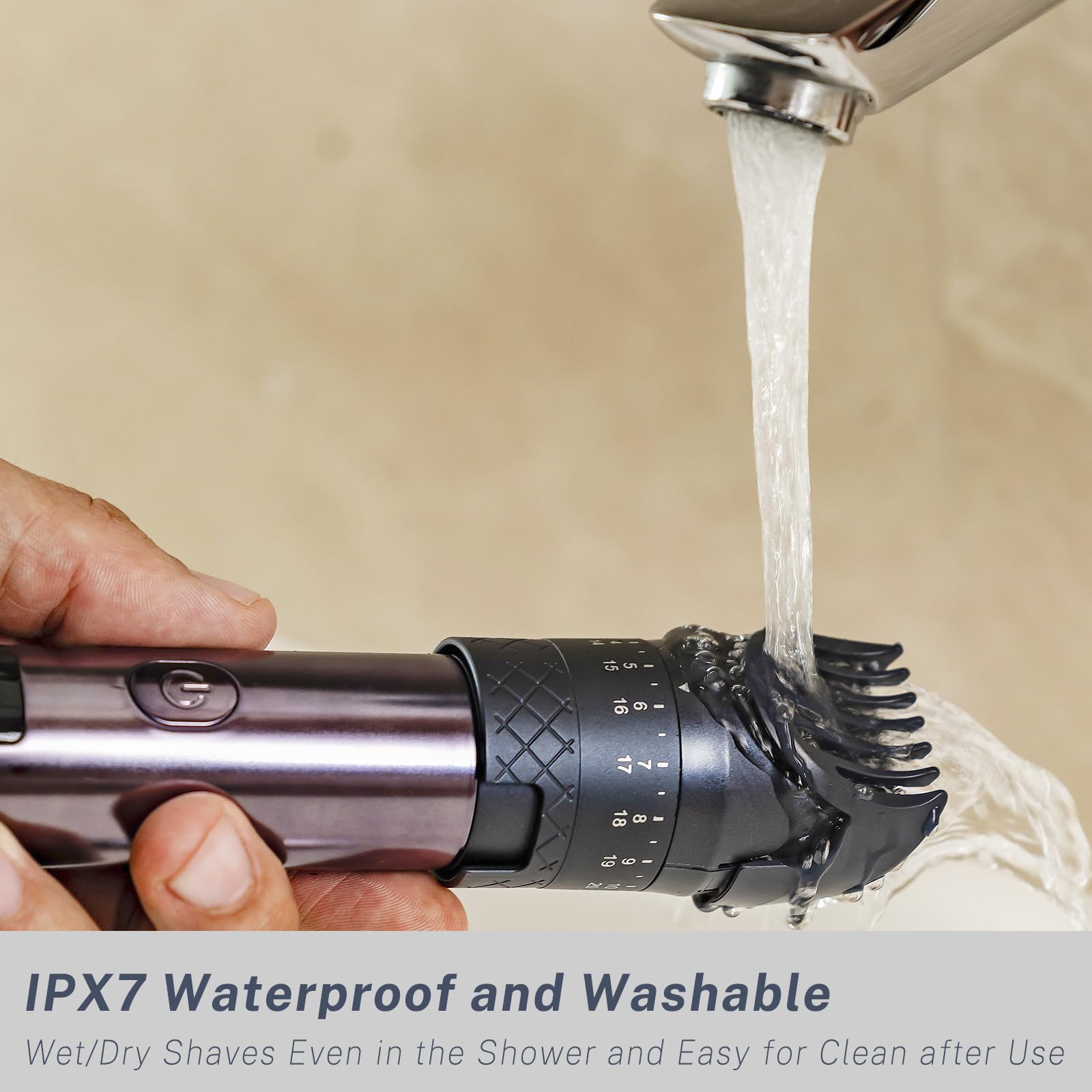 - [ IPX7 Waterproof Wet & Dry ] - The electric beard trimmer for men is 100% waterproof and washable, you can shave/trim dry or wet or even in the shower. After use, you can rinse it under running water for quick cleaning