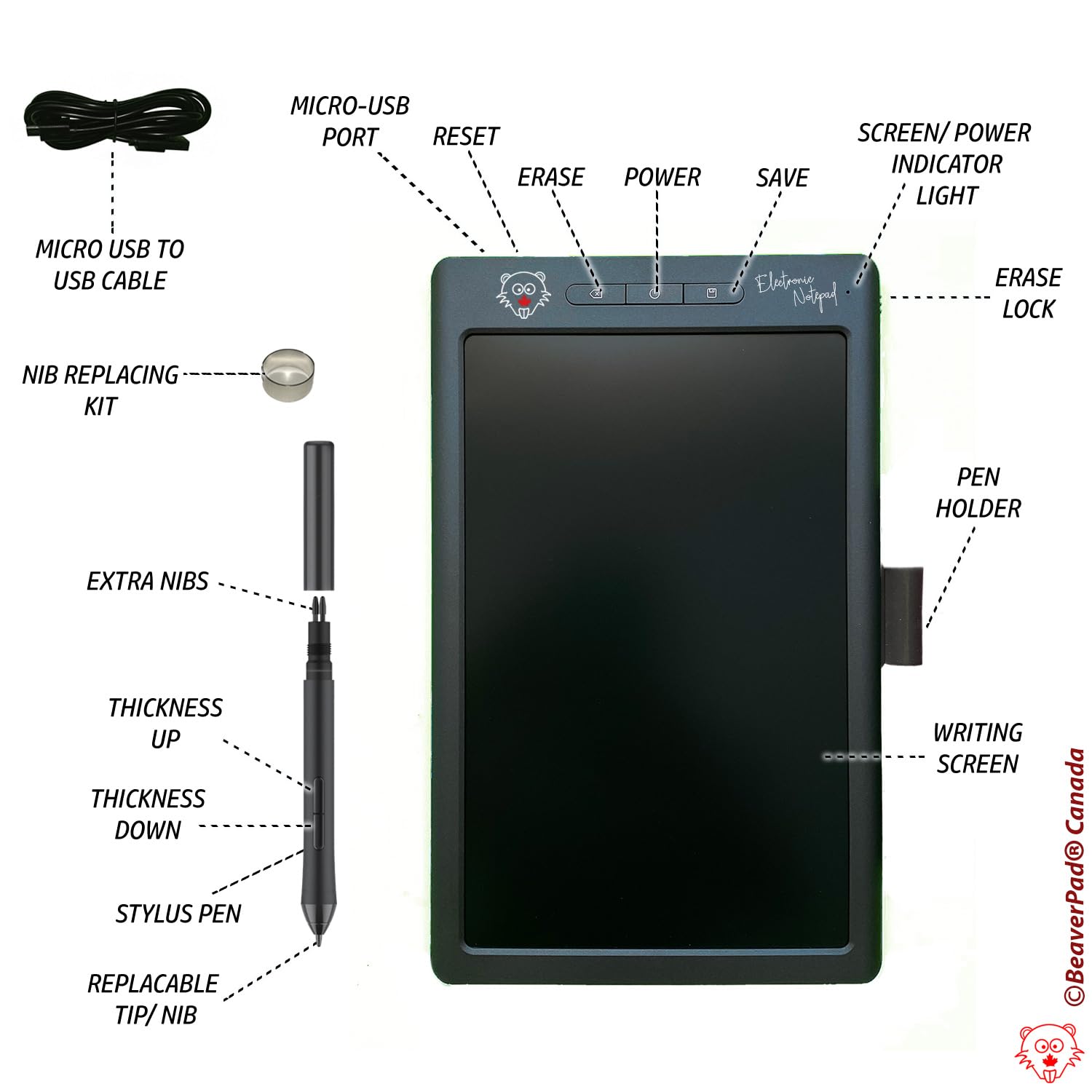 Details: A powerful 10 inch electronic notepad that lets you Write, Save, Sync, Erase, Rewrite, and Share all within the tip of your finger. A 2-in-1 wonder that works as an LCD e-writer pad as well as a graphics tablet when connected to a computer. The BeaverPad LCD Writing Tablet comes with its own dedicated stylus pen with special tips that allows users to write on the pressure sensitive flexible screen of the tablet using a special multi-pressure writing technology - resulting in a very paper-like writing experience for the users.