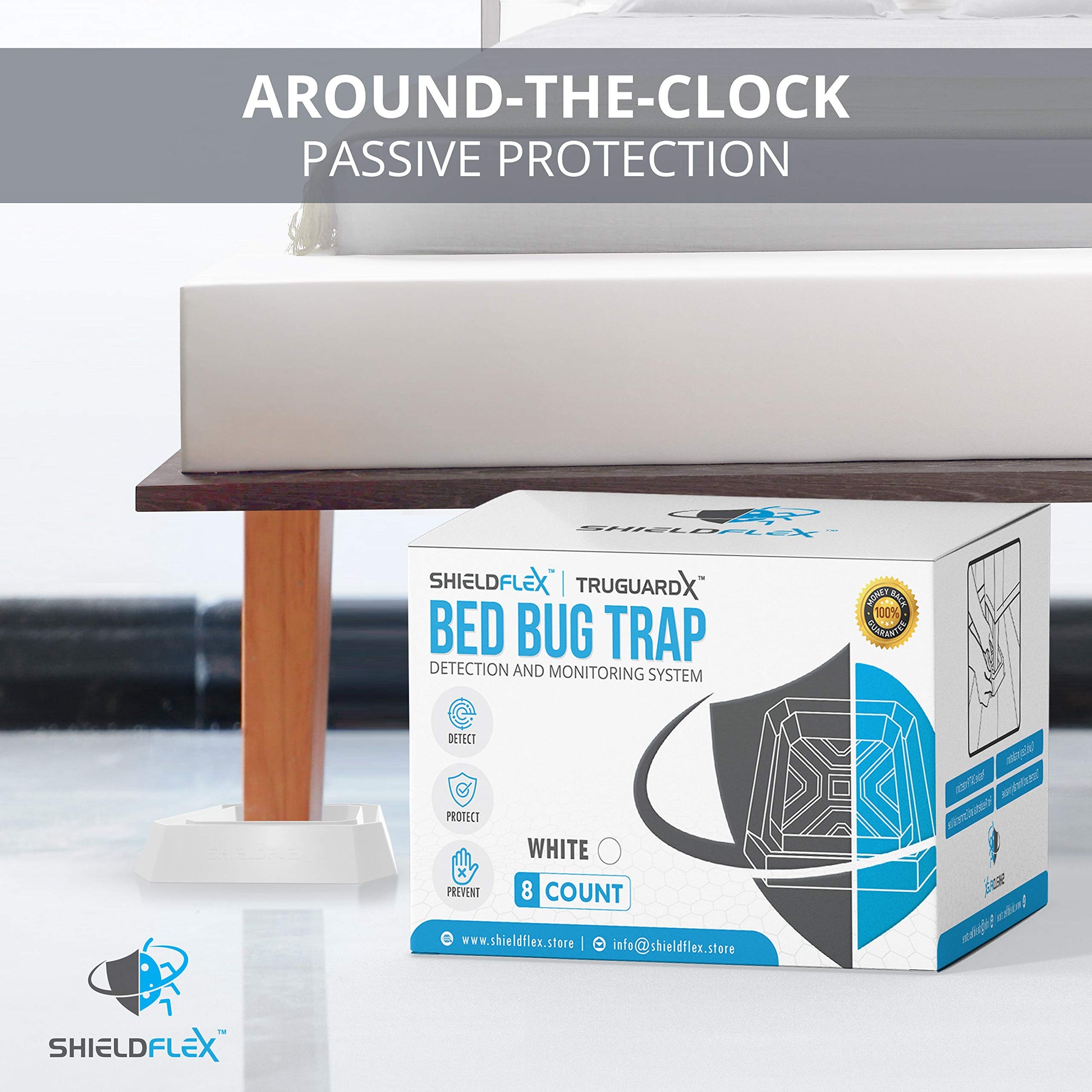 - ☑ DEPENDABLE, PASSIVE BED BUG PROTECTION — End your bed bug infestation before it spreads using the ShieldFlex TruGuard bed bug monitoring and detection system. The TruGuard bedbug interceptor for beds is an essential component of your bed bug treatment kit. Simply place a trap under each of your bed posts and furniture legs and let ShieldFlex do the work.