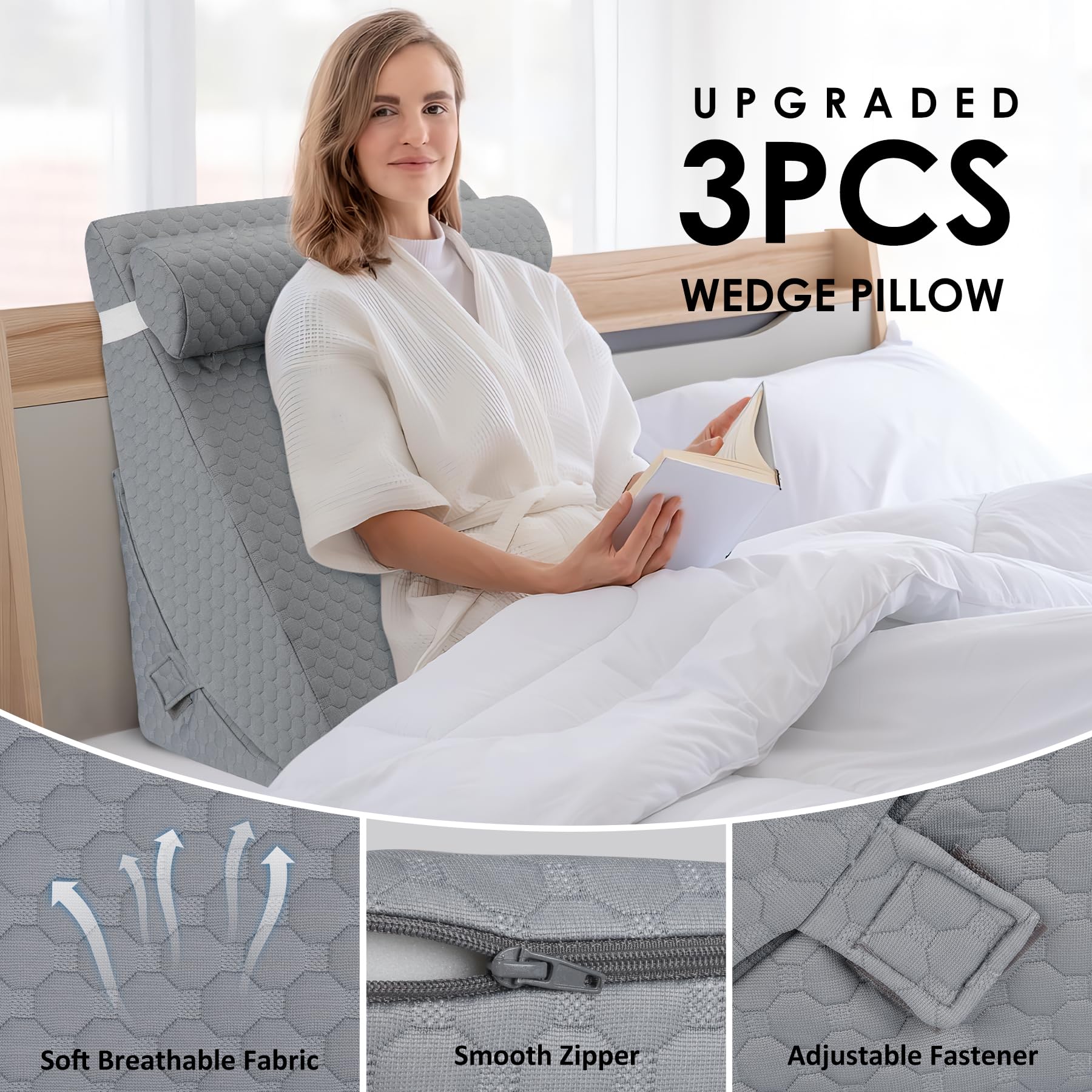 - Washable Cover: Our 3pcs wedge pillow set features a breathable and skin-friendly knitted air layer fabric cover, promoting airflow for a cool sleep experience. The removable cover with a hidden zipper is machine washable for easy maintenance. Wide and foldable velcro sewn on the side allows for various customizable combinations