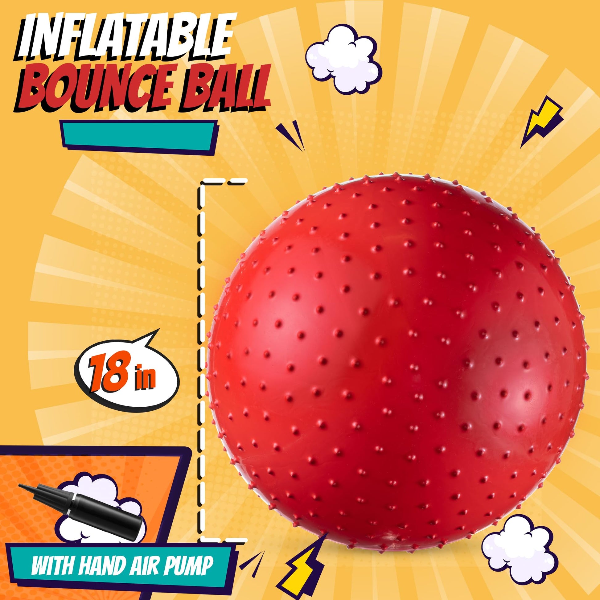 - PACK OF 5 – JUMBO 18 INCH KNOBBY SENSORY BALLS: Each bulk pack of knobby balls includes a total of 5 BIG Sensory Balls in assorted colors. Jumbo Balls will arrive deflated and come complete with an Added Bonus Hand Pump to quickly and easily inflate each ball when ready to play. They measure 18 inches in diameter when inflated and come in bright colors; Yellow, Purple, Red, Green, and Blue