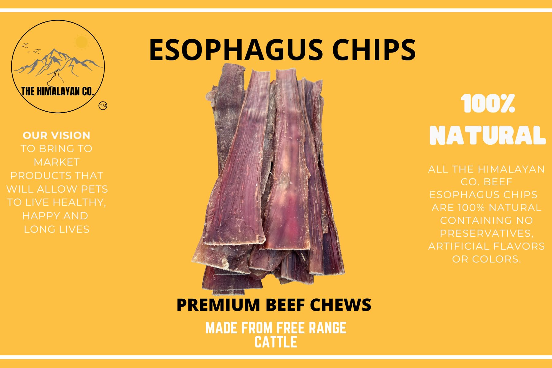 Details: THE HIMALAYAN CO. BEEF ESOPHAGUS CHIPS/JERKY for dogs is crafted with love, care, and dedication using 100% natural Raised Cattle. We strive to provide you with a top-quality, irresistibly delicious, and wholesome treat that will have your dog begging for more! Our Beef Jerky Treats are an excellent option for light chewers, dogs with dental issues, small breeds, and puppies while offering an exceptionally flavorful chew. Our Esophagus Chews are made with a single ingredient, ensuring a pure and wholesome treat. They are free from chemicals, artificial flavors, additives, preservatives, and colors.