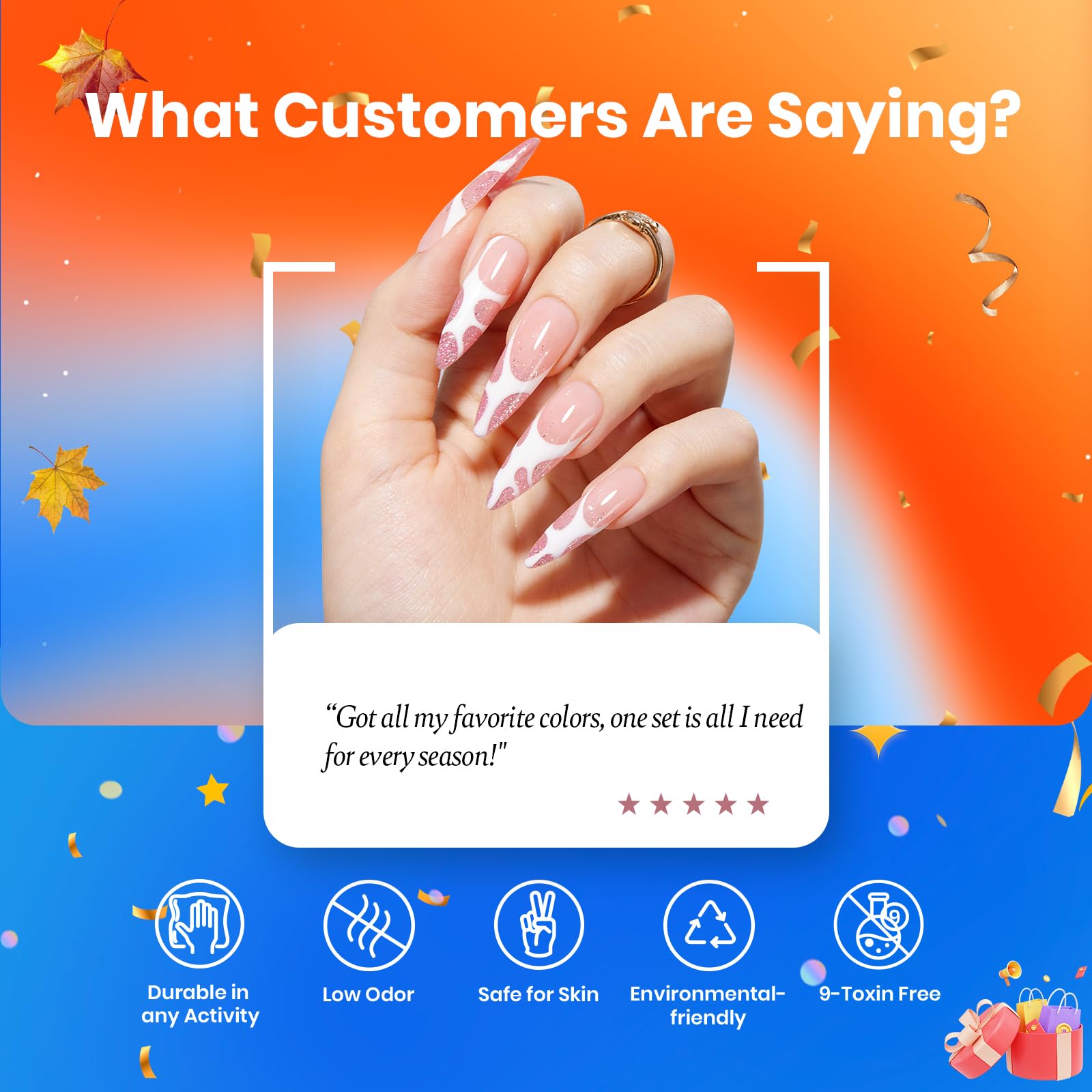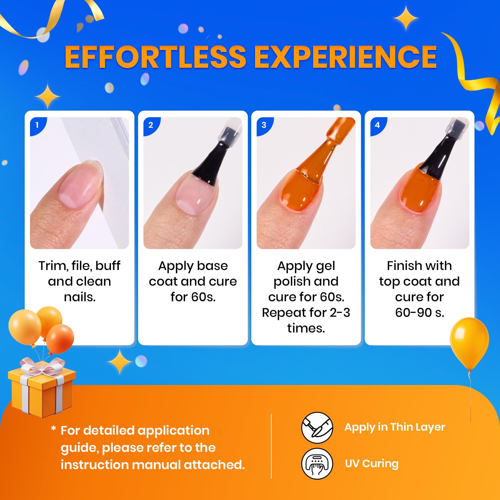 - Speed Curing with LED Nail Lamp: The nail gel polish gift set need to be cured under LED Dryer Lamp. Base and Top coat required. Average for LED Lamp 60-120 secs. Only used for nail and Non-direct contact with the skin. Wash immediately if contact occurs. If you feel unwell, instantly stop using and seek medical attention. Keep the products away from the pregnant and the kids.