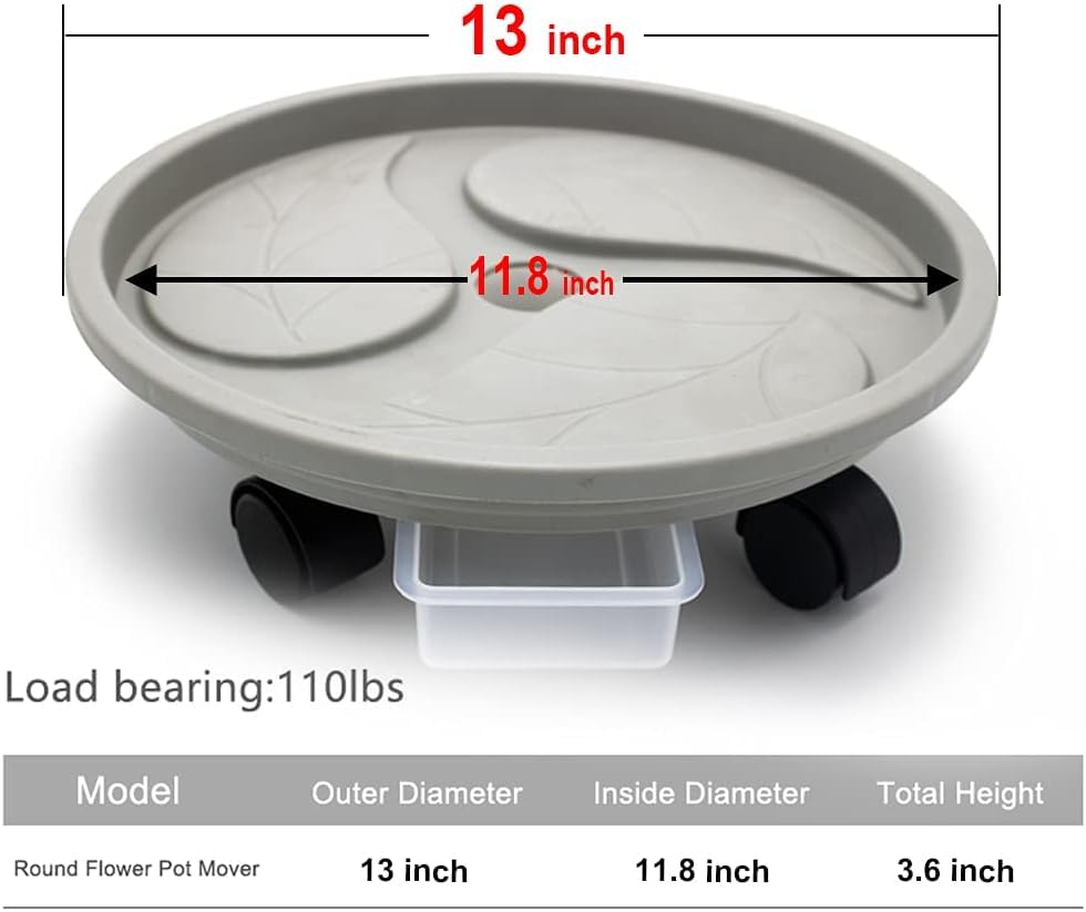 - DIMENSIONS: 13 inch Outside diameter, 11.8 inch inner diameter, load weight 110 lbs.It's recommended that the diameter of flower pot base within 11 inch use this size.