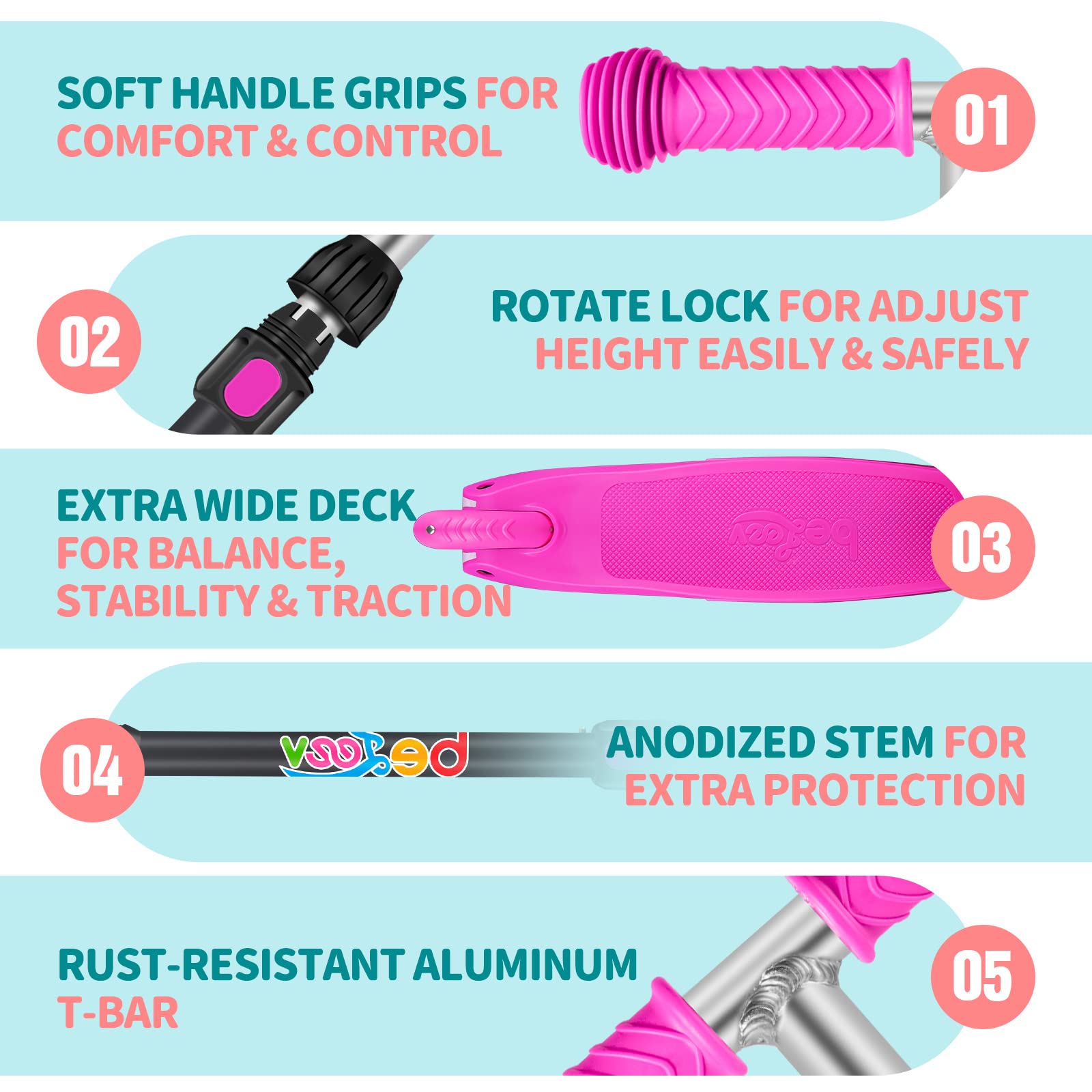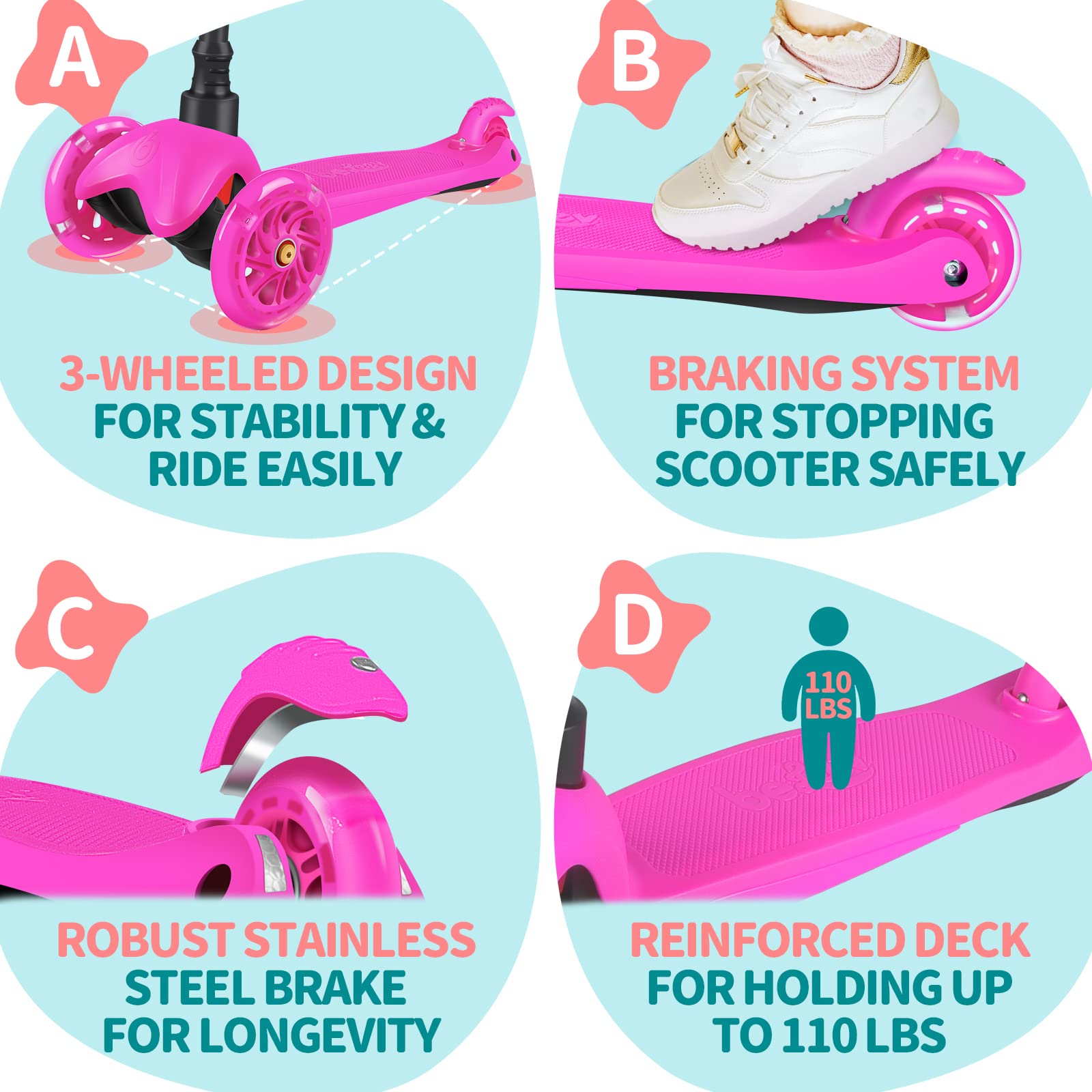 - Turn and Stop with Ease: The 3 wheel scooter utilizes a Lean-to-Steer system, kids use their body weight to safely steer, making steering a breeze. It helps children build up their coordination, balance, and motor skills as they ride. A foot brake with built-in stainless steel on the back wheel that even young kids can use with ease, effectively slow down and stop the scooter safely, avoid falls and accidents.