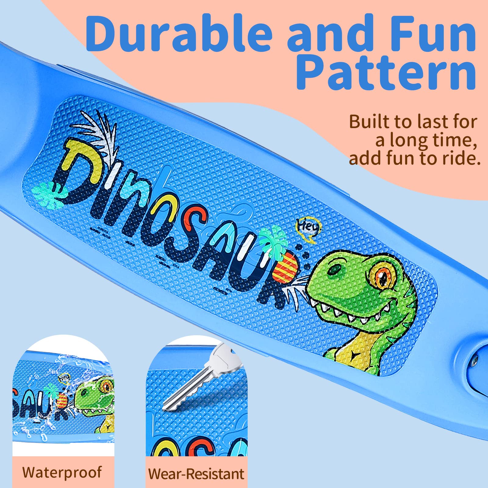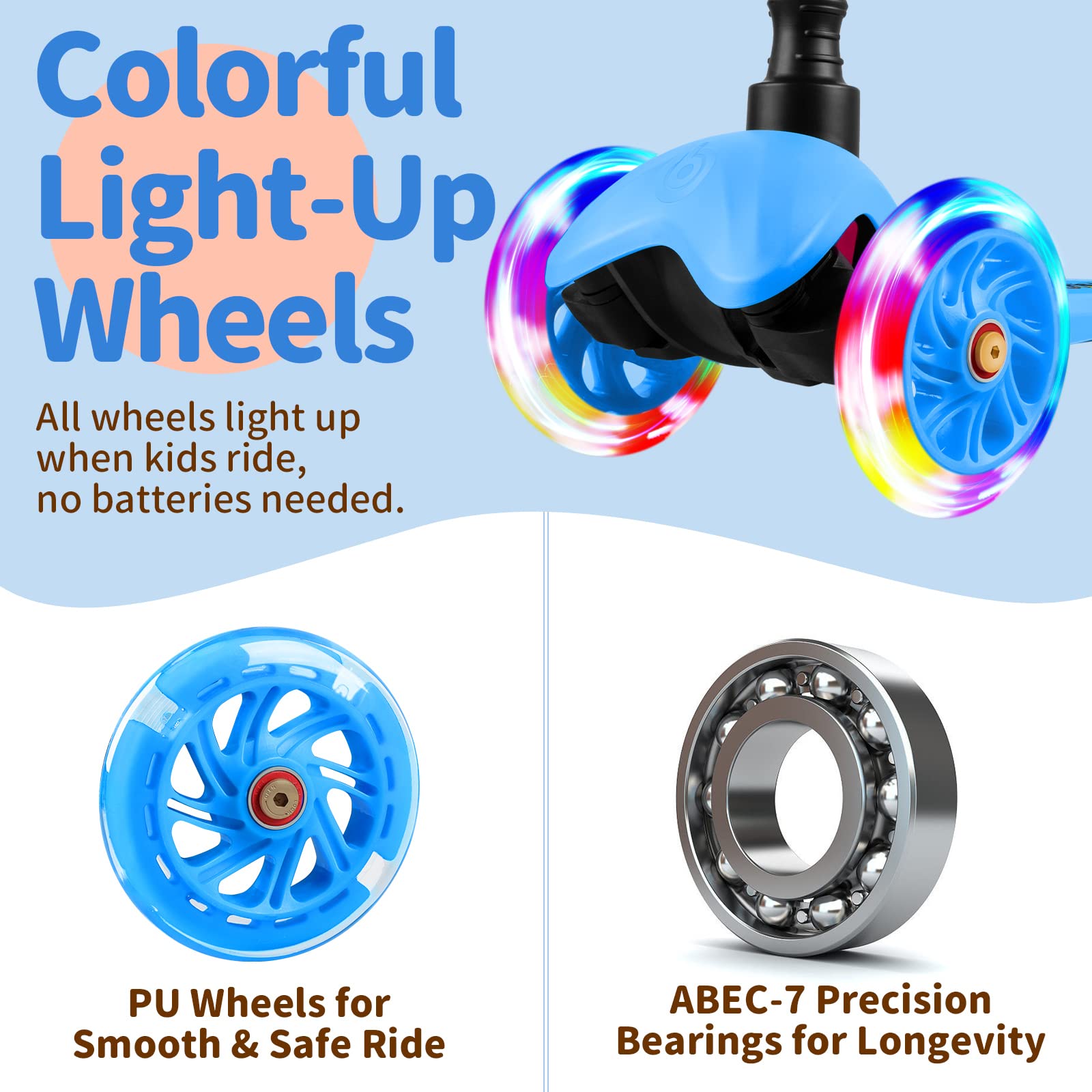 - Turn and Stop with Ease: The 3 wheel scooter utilizes a Lean-to-Steer system, kids use their body weight to safely steer, making steering a breeze. It helps children build up their coordination, balance, and motor skills as they ride. A foot brake with built-in stainless steel on the back wheel that even young kids can use with ease, effectively slow down and stop the scooter safely, avoid falls and accidents.