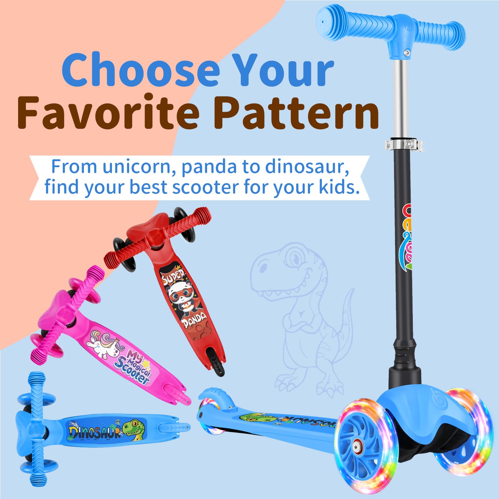 - Ideal Gifts as First Scooter: The kids scooter designs with adjustable handlebar, allowing their new favorite toy to grow with them from ages 2-6, up to 44 lbs. 4 adjustable height options(22.5"/24"/26"/28.1" above the ground) enable kids to find their perfect scooting position(no tools required). Accommodate kids between 34 and 47 inches tall. Children can start scooting earlier and keep going for longer.