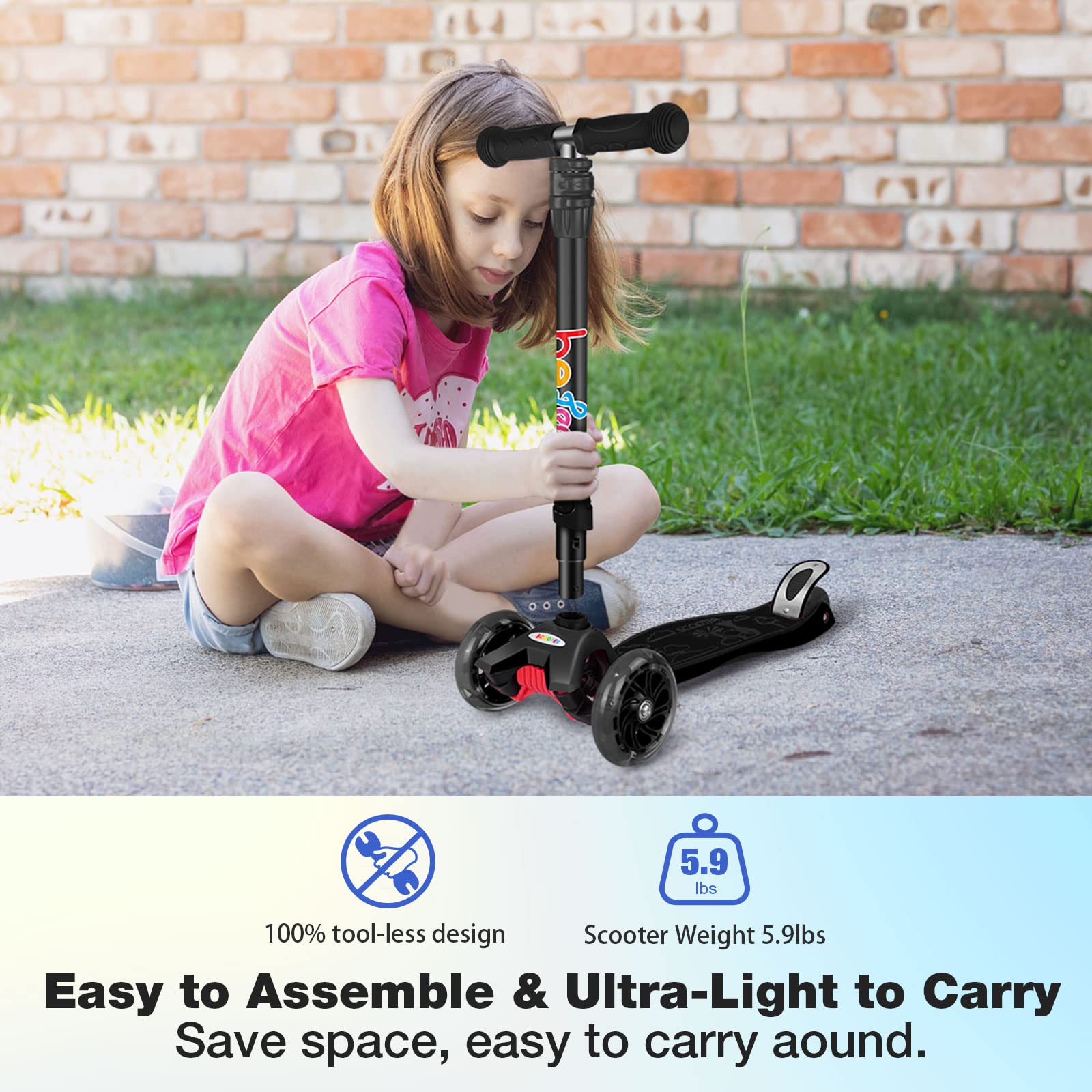 - Adjustable Handlebars: BELEEV kick scooters has detachable adjustable T-bar with aluminum alloy twisting lock, soft rubber hand grips, 3 adjustable height options (29.2 /31.5 /34 in) to accommodate ages 3 to 12 year old.