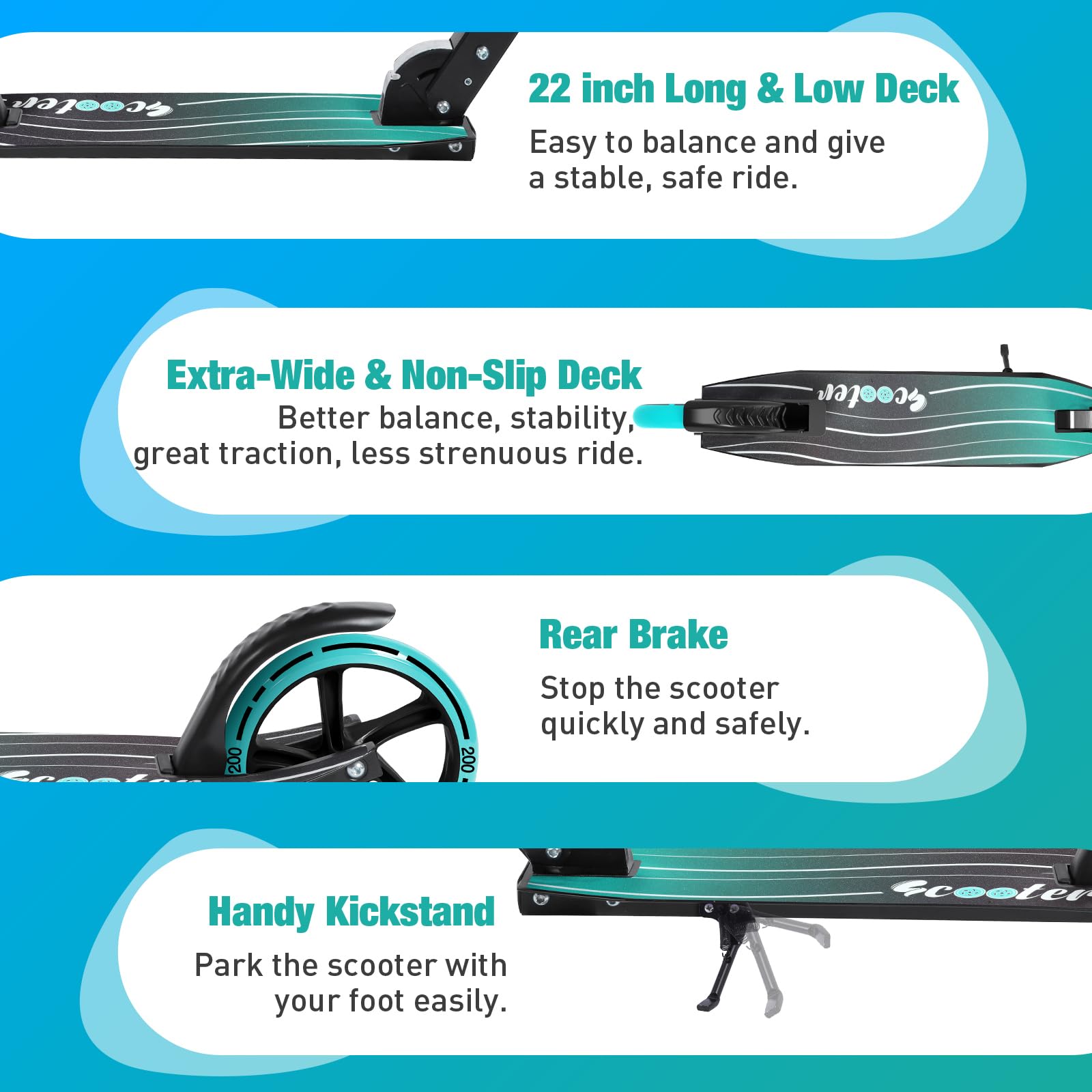 - Safe and Smooth Riding: The 2 wheels scooter with PU high-rebound 200mm extra-large wheels, ABEC-7 bearings and Shock Absorption Mechanism make a smoother ride and creates a comfortable glide, perfect for City/Urban/Suburban pavements. Reliable brakes for stopping scooter quickly and easily.