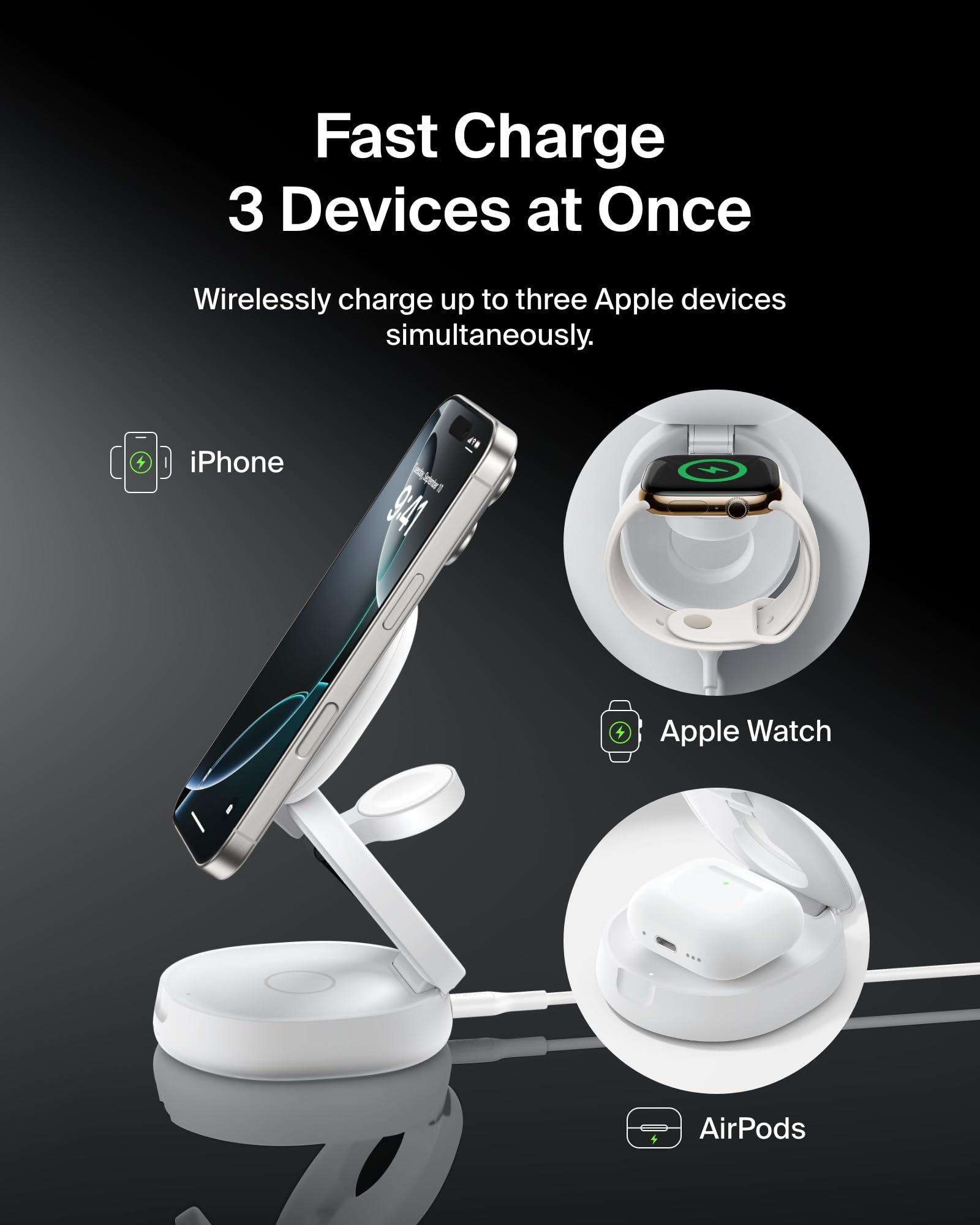 - SIMULTANEOUS CHARGING, EASY ALIGNMENT: Wirelessly charge your iPhone, Apple Watch, and AirPods at the same time to quickly and conveniently prepare for your next adventure. Magnetic alignment easily snaps your phone in place for perfect charging.