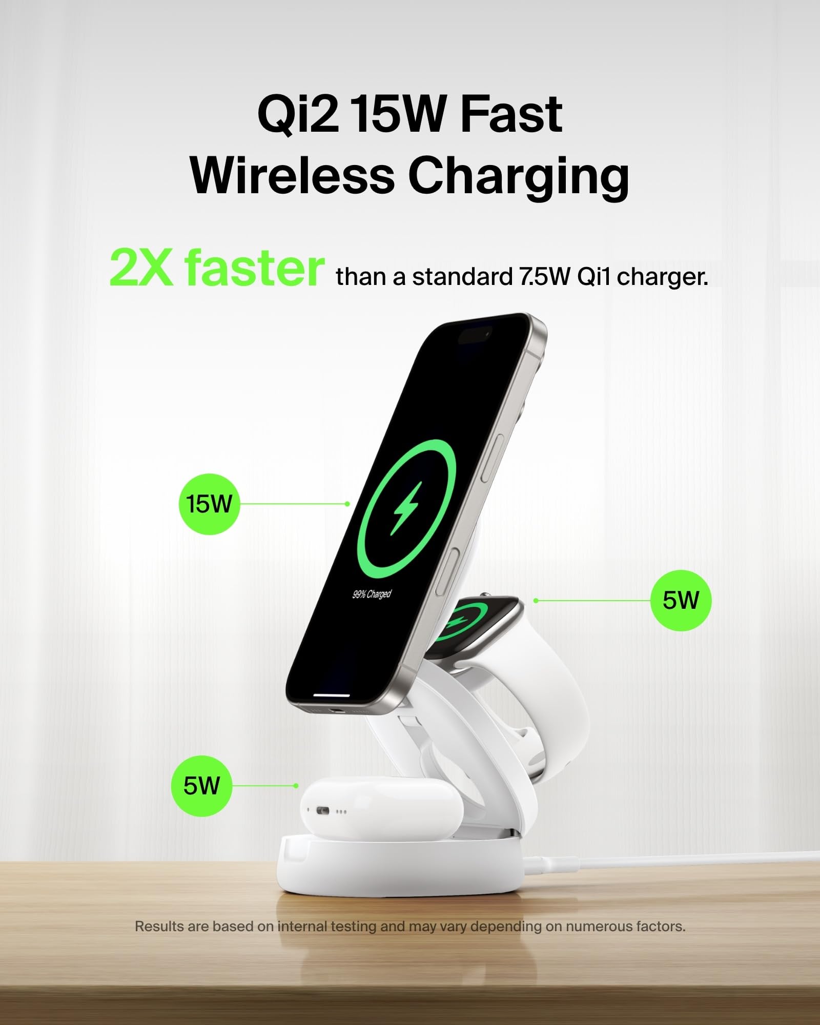 *Based on internal testing. Belkin Qi2 15W wireless charger charges iPhone 15 from 0-50% up to 2x faster than a Qi 5W wireless charger and up to 1.5x faster than a Qi 7.5W wireless charger. Charge time varies with environmental factors; results may vary.