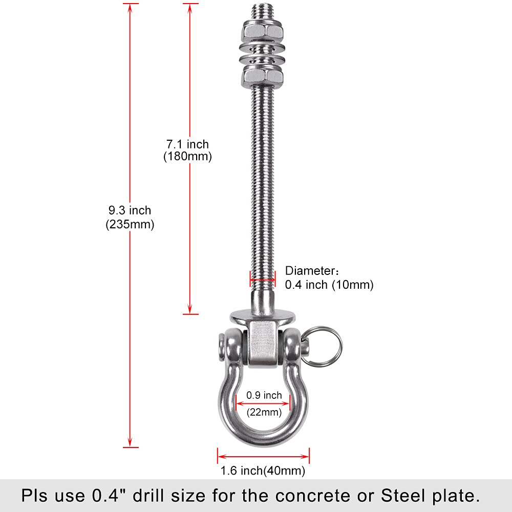 - EASY TO INSTALL: Pilot hole needs to be drilled in the wood or Metal Beam prior to installation. When mounting on wood, place two tight nuts and washers on top and tighten. When mounting on a metal beam, place one of the nuts and washers on top and the other on the other side of the beam and tighten. The swing ring can be detached, even if your chain, rope or connecting buckle is closed, it can be connected.