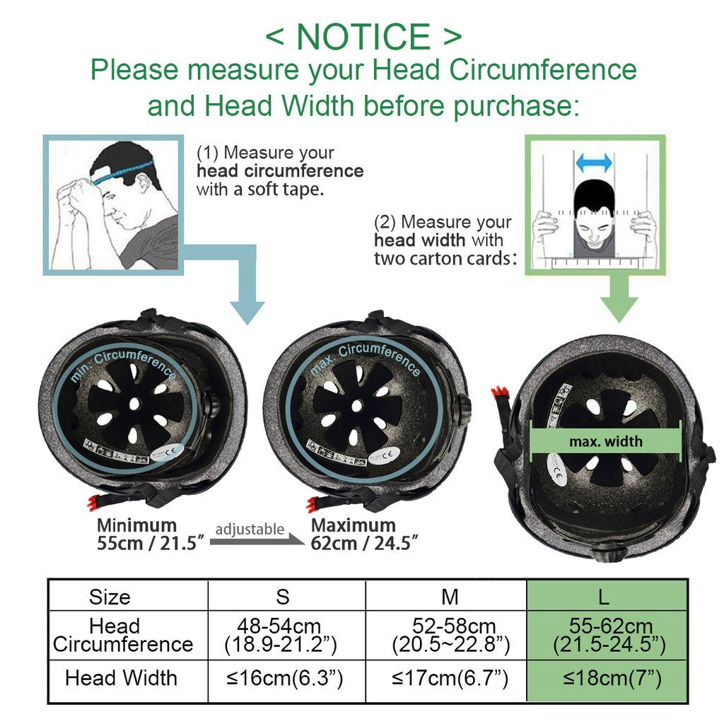 - Helmet Sizes: L: for head Size: about 57-62cm/22.4-24.5 inch. Skateboard / Skate Protection Gear Size: L: Fit for weight 121.3-176.4lbs (fit for adults)