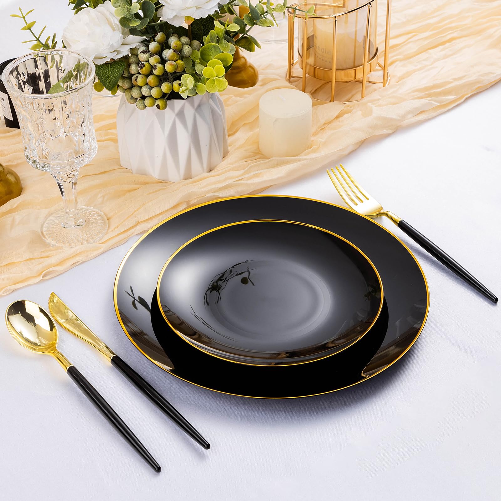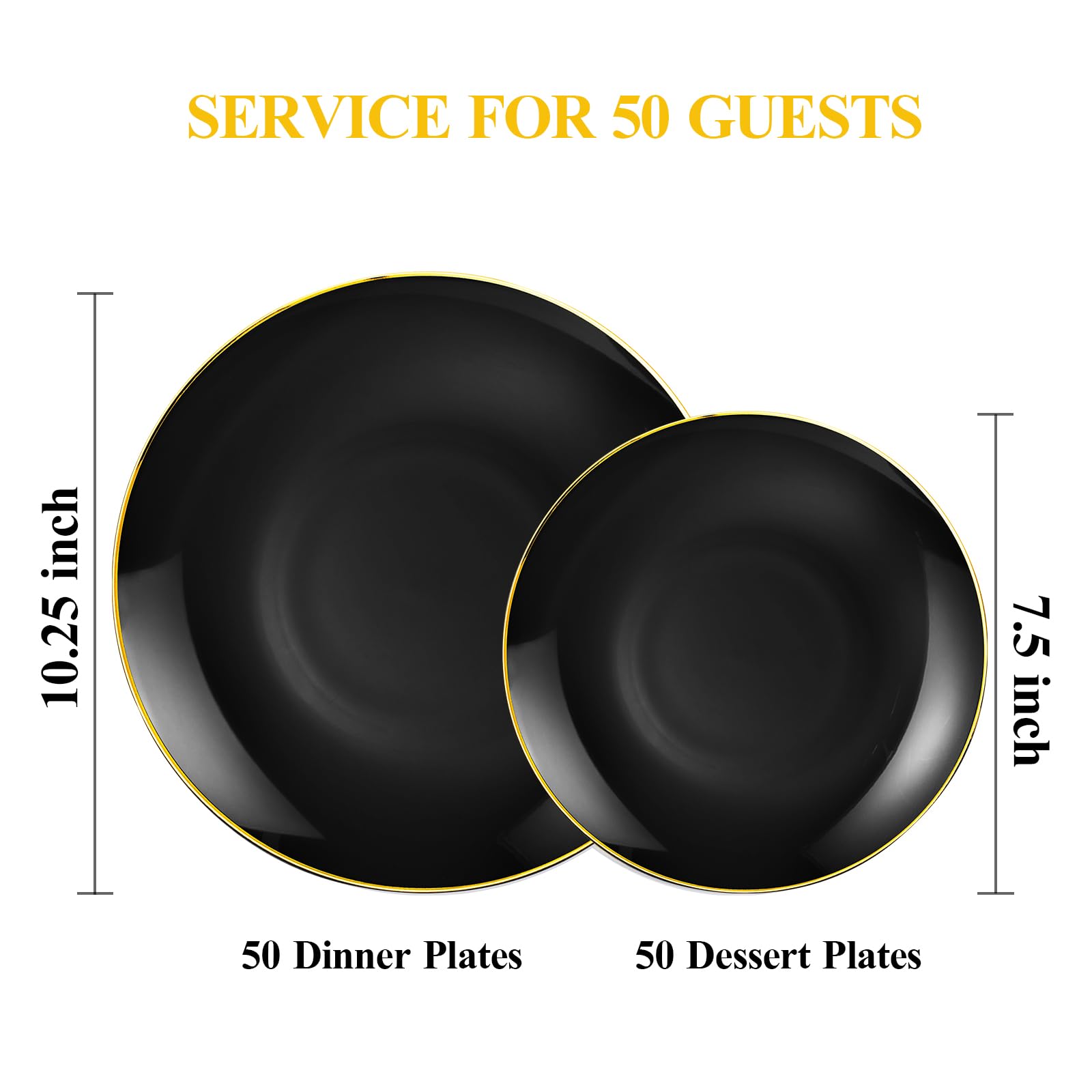 - VALUE PACK: Our black disposable plates for party include 50 dinner plates measuring 10.25 inches and 50 salad plates measuring 7.5 inches, which can accommodate the dining needs of 50 people at once. Just spend more time with your family and friends with our black and gold plastic plate set!