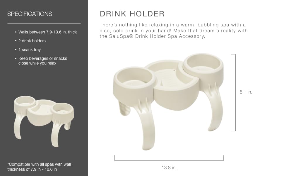 - COMPATIBLE WITH MOST HOT TUBS: This drink holder and snack tray is compatible with all spas (SaluSpa, Intex, Coleman, GoPlus, etc.) with a wall thickness of 7.9-10.6 inches.