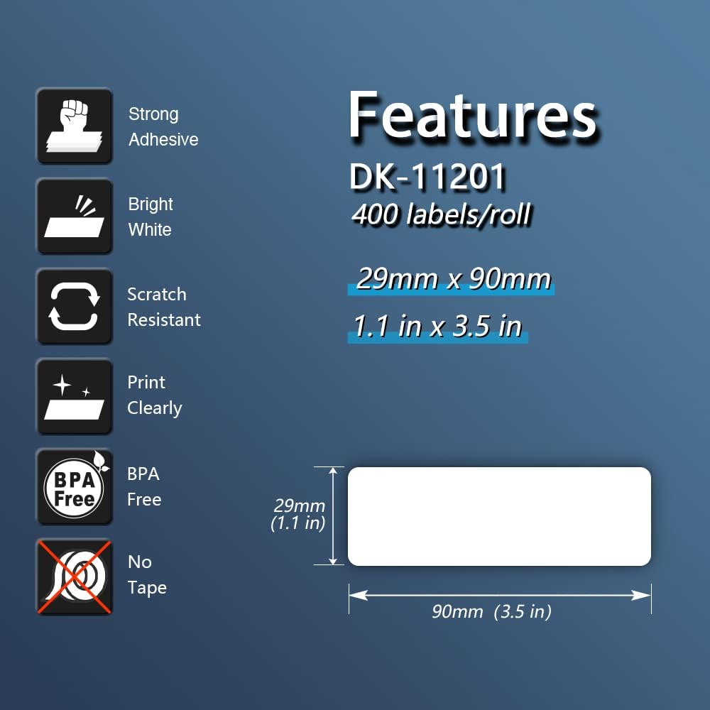 - [ Multi-purpose Labels ]: 1.1 x 3.5 inch (29mm x 90mm) multi-purpose labels replace for for Brother DK-1201 are mainly used as standard address labels. Barcode labels and FNSKU labels are also applicable. Widely used on packages, envelopes, mails, letters, parcels, signs and temporary name tags. You name it.