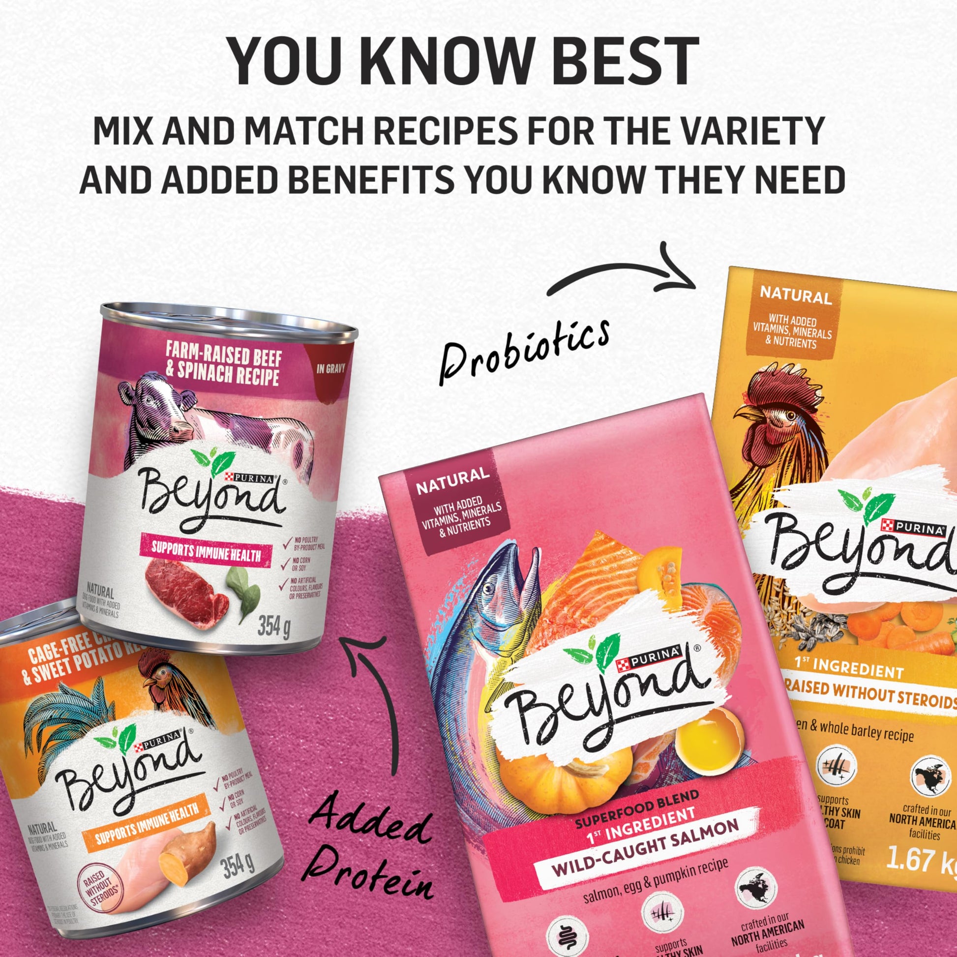 Details: Offer your dog purposeful nutrition with Purina® Beyond ® Beef and Spinach Recipe adult wet dog food with gravy. Made with real beef, accents of spinach, and other high-quality ingredients, this Purina adult dog food provides you with a nutritious way to go Beyond for your dog. When creating this gravy dog food, our pet nutritionists thoughtfully select each ingredient for a purpose and use foods that can be traced back to our trusted sources, so your dog gets wet food they look forward to eating. Working together, these ingredients help to craft a high-quality wet dog food that helps support your dog’s long, healthy life. A savory gravy adds delicious flavor, and we formulate this wholesome high protein canned dog food with no poultry by-product meal, artificial colours, flavours, or preservatives. The result is a canned dog food that meets your high standards. Offer your adult dog a simply made, natural dog food with added vitamins and minerals that delivers complete and balanced nutrition. With these canned dog food chunks, you can rest easy knowing your dog is getting a wet dog food in gravy that feeds them as nature intended. Look to our complete line to mix and match with your dog’s favourite Beyond dry dog food and create their meals your way.