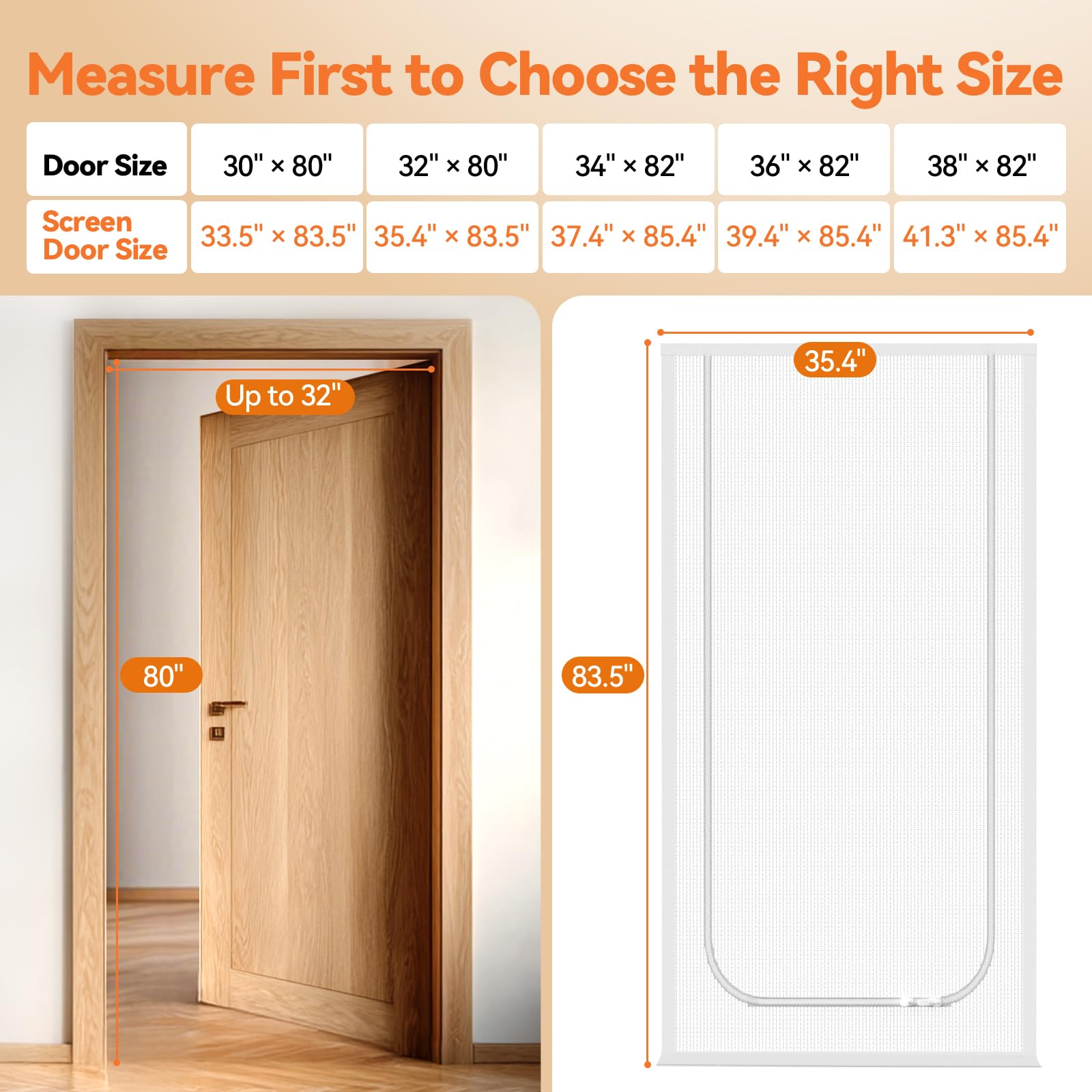 - Fits Door Sizes Up To 32x80": Width up to 32'', length up to 80'' (door size only, not including the door frame). Door frame size requires ≥35.4" at the same time. The actual size of the cat screen door is 35.4*83.5” and its must be affixed to the door frame. Please measure your door in advance to ensure that the right size is selected