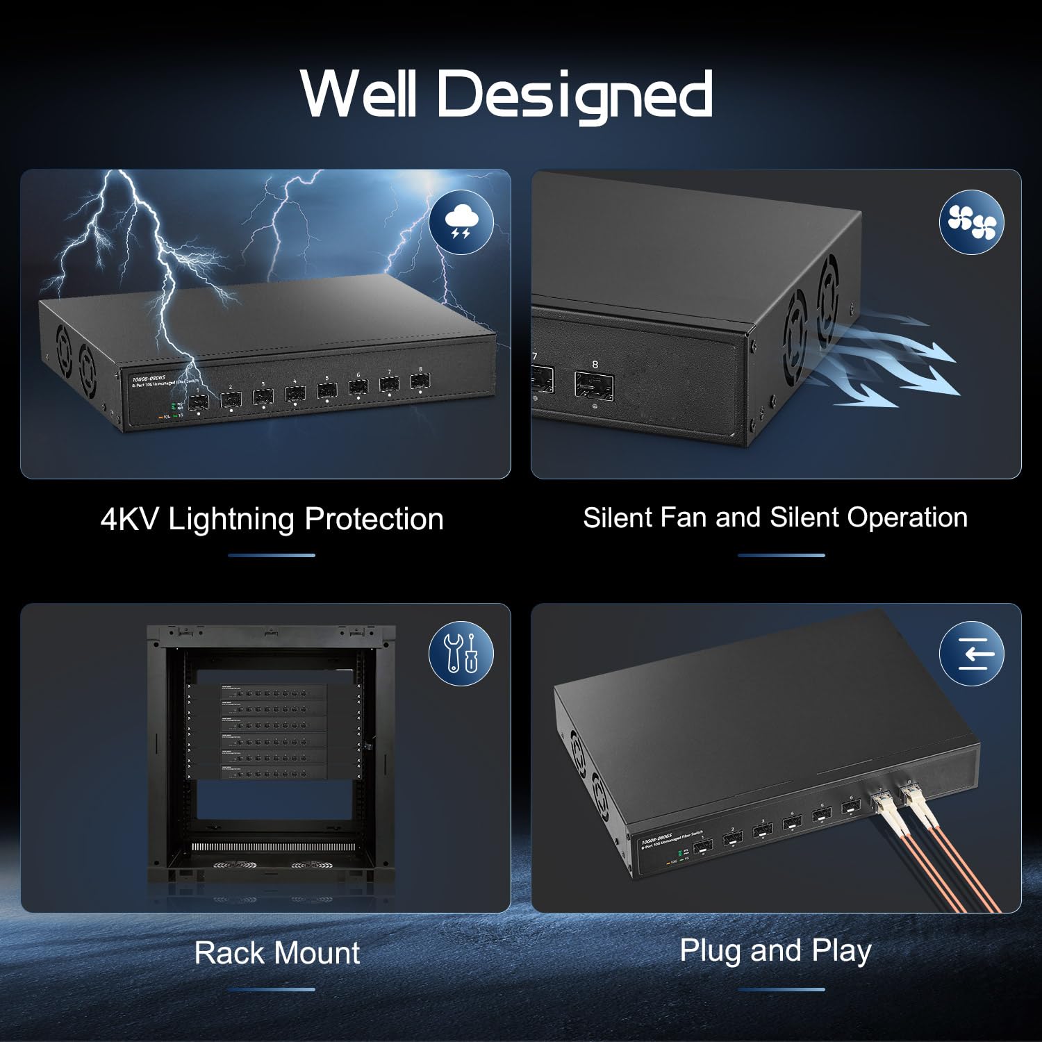 - 【Unmanaged Plug and Play】 Just connect the power cord, insert the optical modules, and connect to the device through the fiber cable, no other configuration is required, the LED indicator on the panel show the power supply and ports status