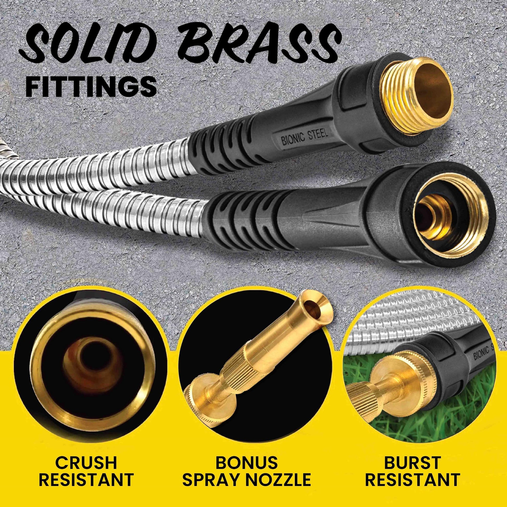- Ultra Durable: Our hoses are constructed from a commercial-grade 304 stainless steel that is extremely durable, doesn’t rust, is resistant to leaks, punctures and extended drags over tough surfaces. BIONIC STEEL PRO VERSION- Brand New for 2021, the Bionic Steel hose has been reimagined with an improved design, brass crush resistant fittings & stabilizer collar, and are engineered to withstand extreme force while the on/off valve makes the output easy to control