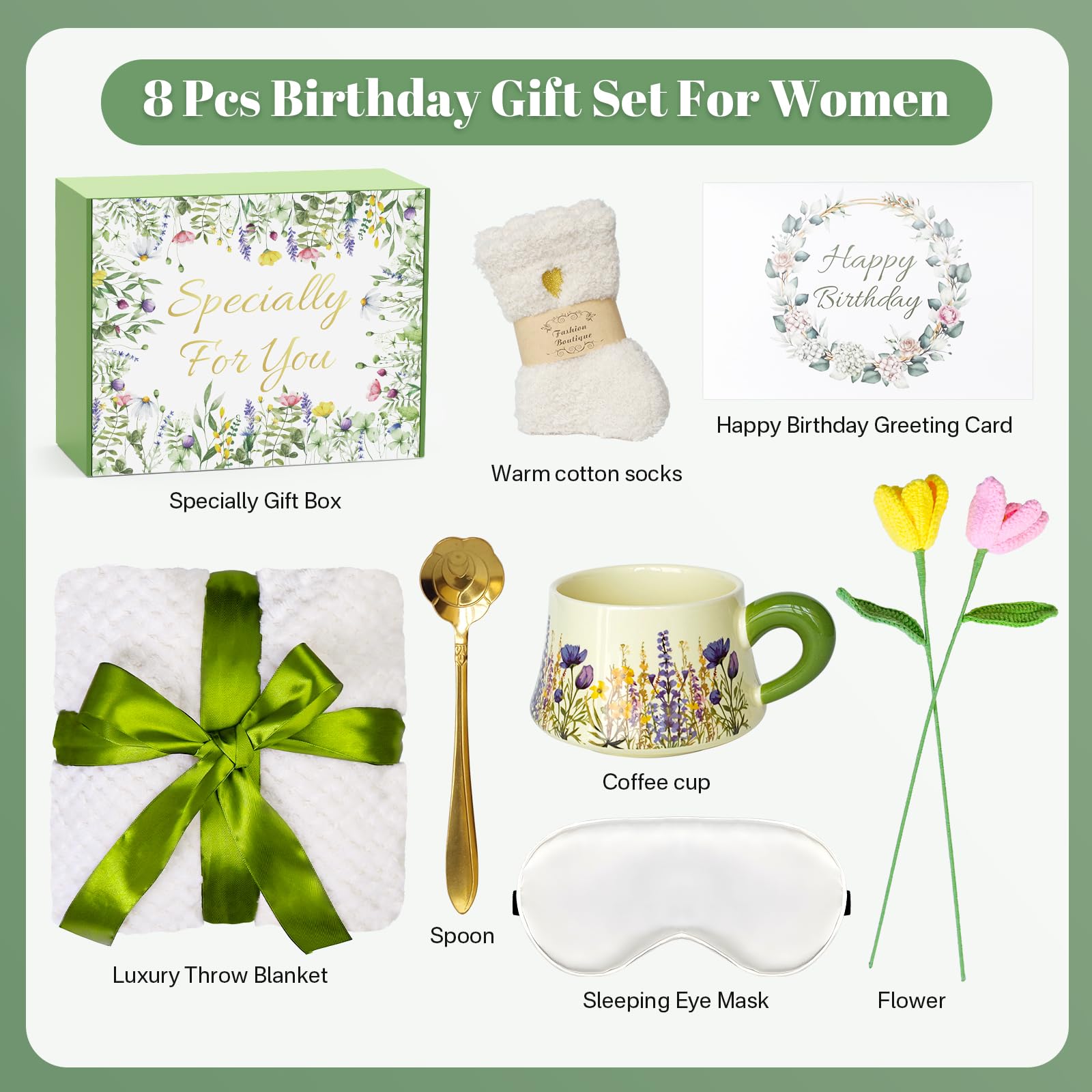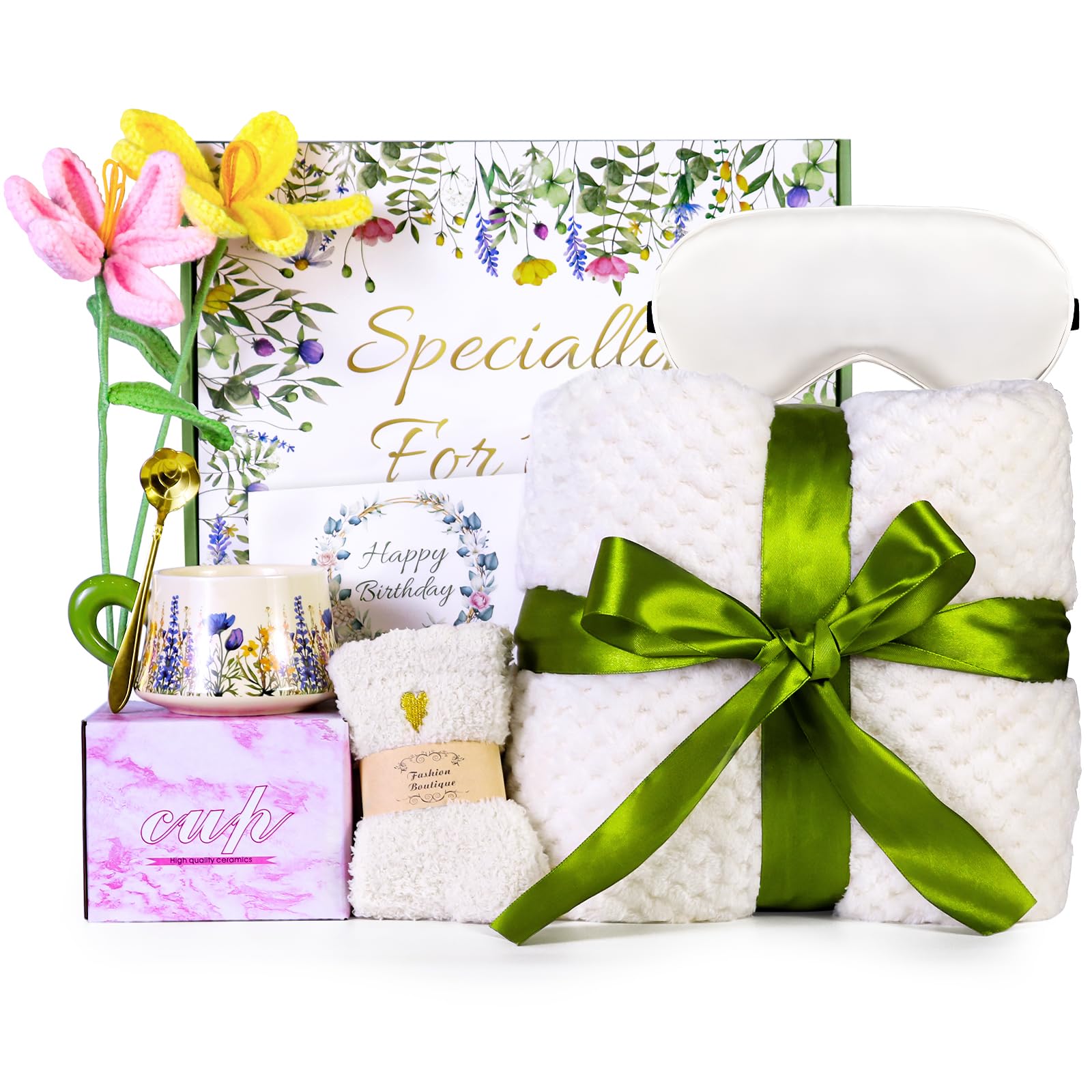 - Surprises hidden inside the gift box: including luxury flannel blanket, mug,spoon,silk eye mask,fuzzy socks, Knitted flowers,happy birthday card,and elegant gift box. Inside this thoughtfully curated box, She will find everything She need to feel cherished and cozy.