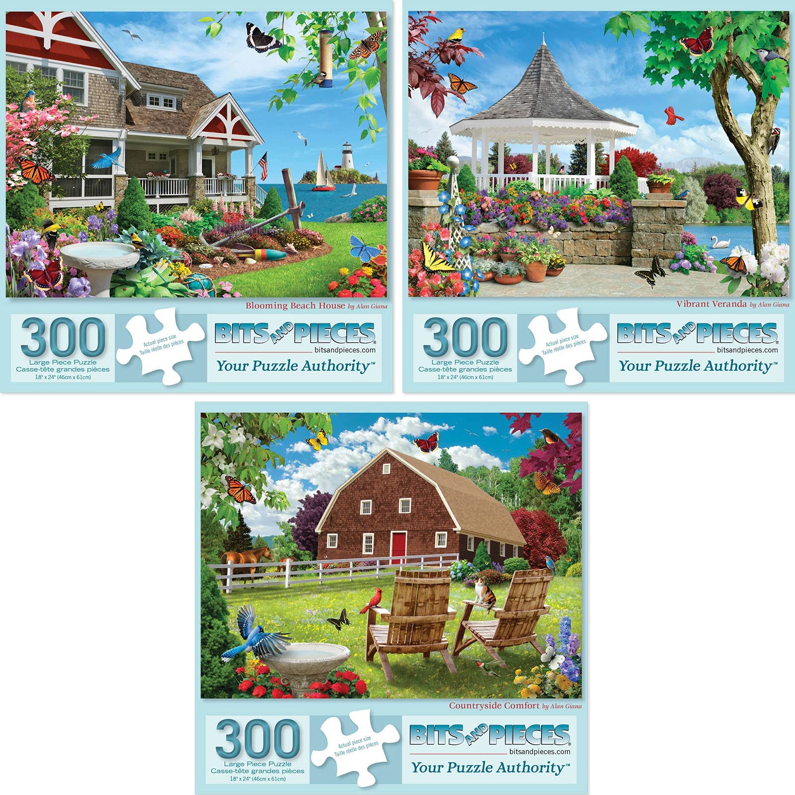 Bits and Pieces - Value Set of Three (3) 300 Piece Jigsaw Puzzles for Adults - 18" x 24" (46cm x 61cm) Each - 300 pc Vibrant Blooming Branch House Countryside Flowers Summer Jigsaws by Alan Giana