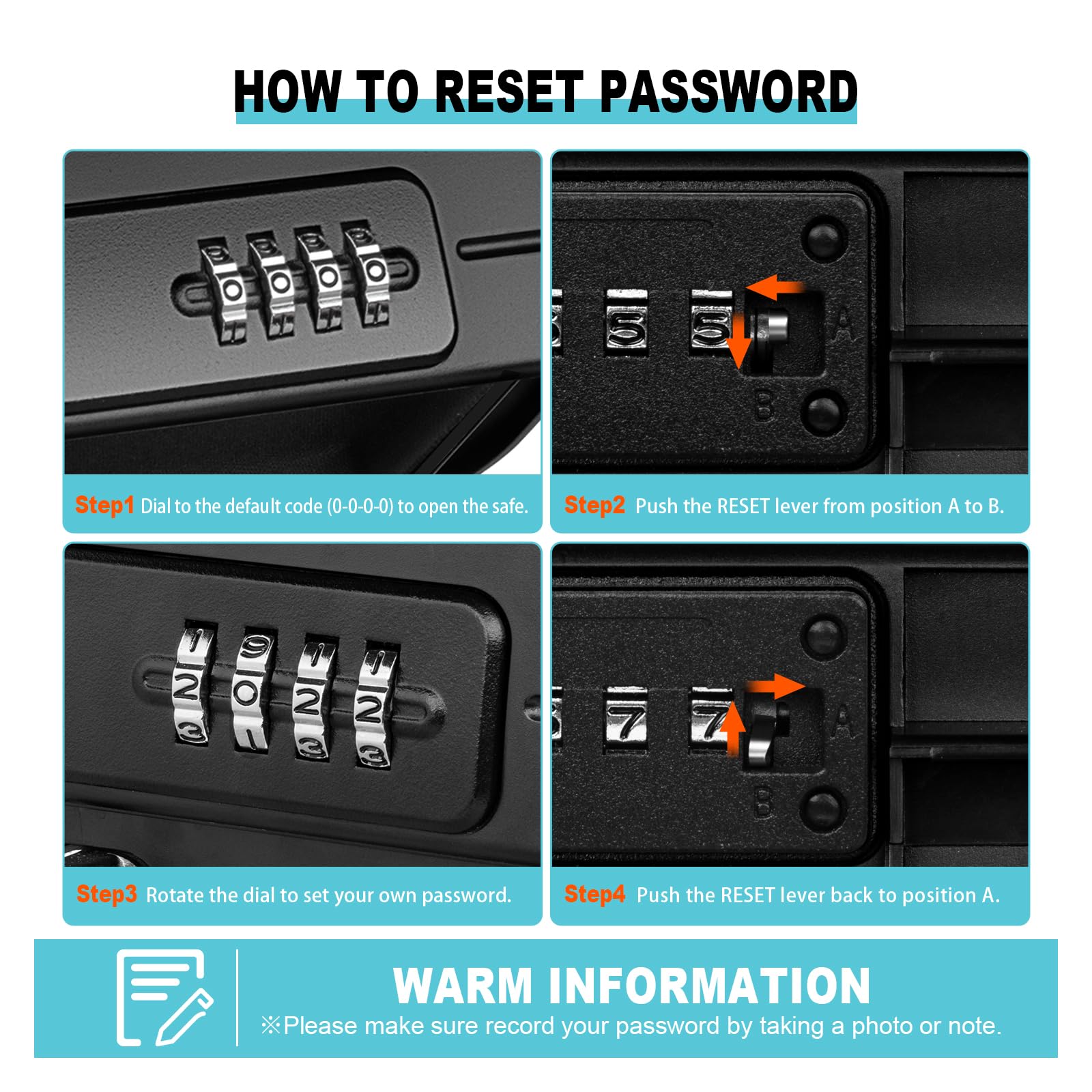 - đăHigher Security Small Safe Boxă4-digit combination lock box provides up to 10,000 different combinations, far more than 3-digit combination, which is more difficult to crack. The default combination of beach locker is 0-0-0-0 and you can reset your personal password by following very simple instructions. Tips: â Please make sure that after the password is reset, it is best to take a photo to record, otherwise it cannot be opened again. â Passwords can be changed periodically to maximize security.