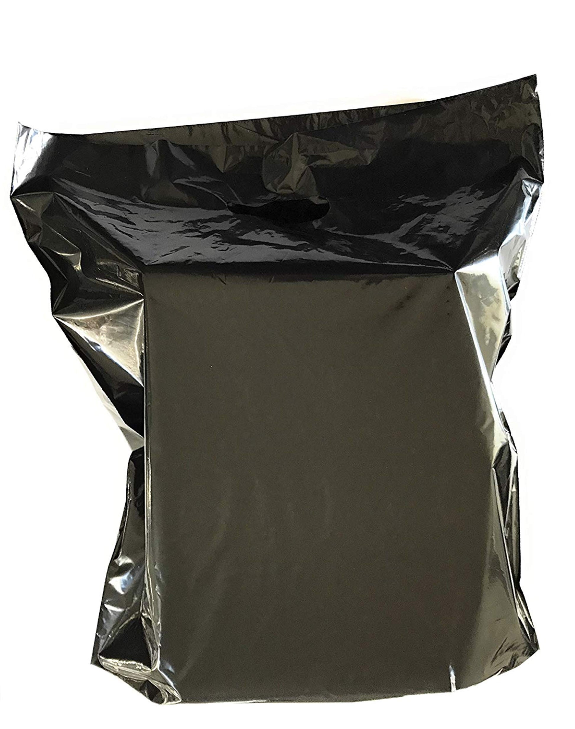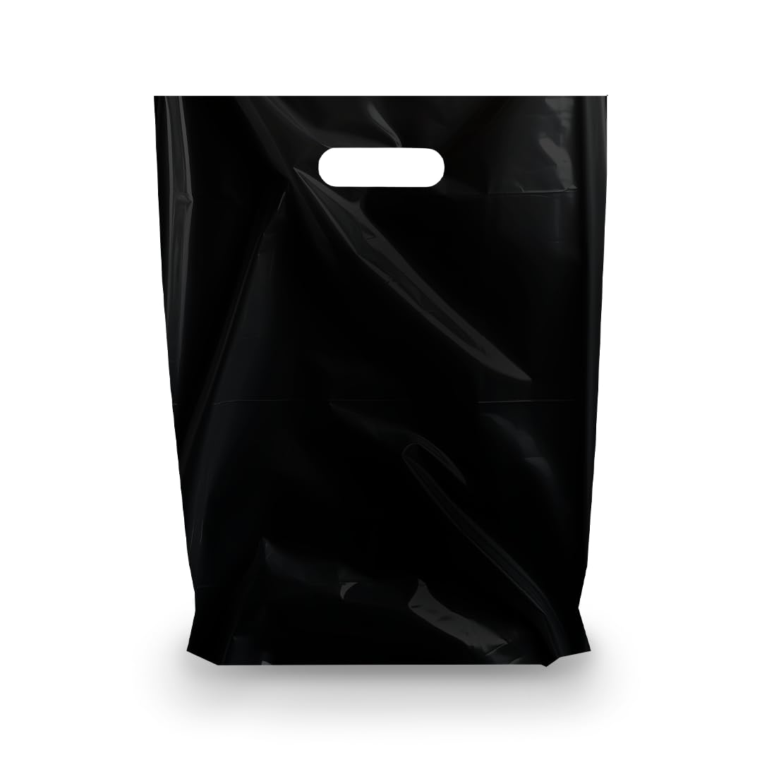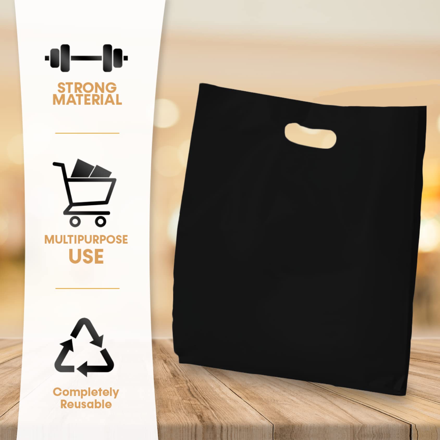 - ✅ Premiun black plastic Merchandise Bags packages (100/200/500): Die Cut Handles, No Gusset, 1.25 Mil. Strong, Durable, and Tear Resistant Bags Perfect for Retail, Boutiques, or Any Events.