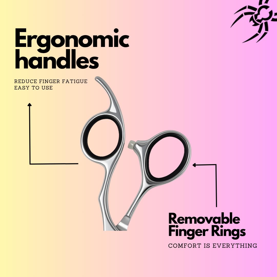 - SUAVE, ERGONOMIC DESIGN - Black Widow’s haircut thinning scissors and professional barber shears have 3D ergonomic streamline handles with offset oval thumb holes and black finger bands for support. They feel adequate in the hand and distribute weight evenly, causing less stress on shoulders when working